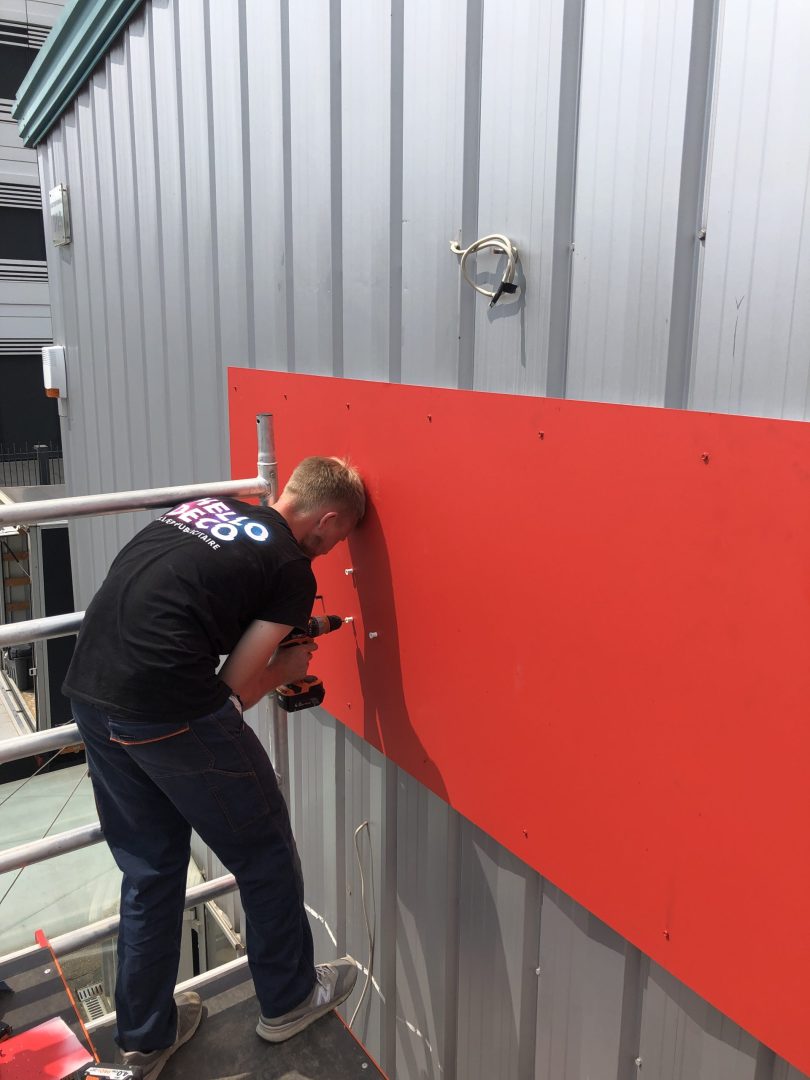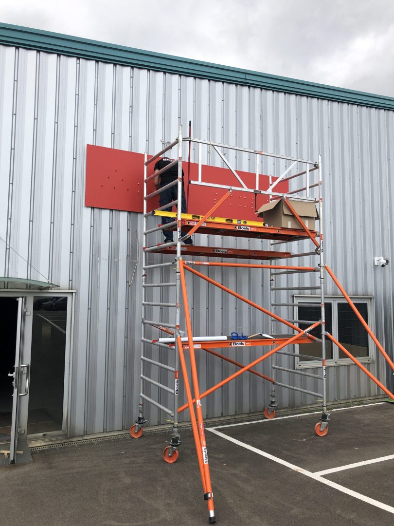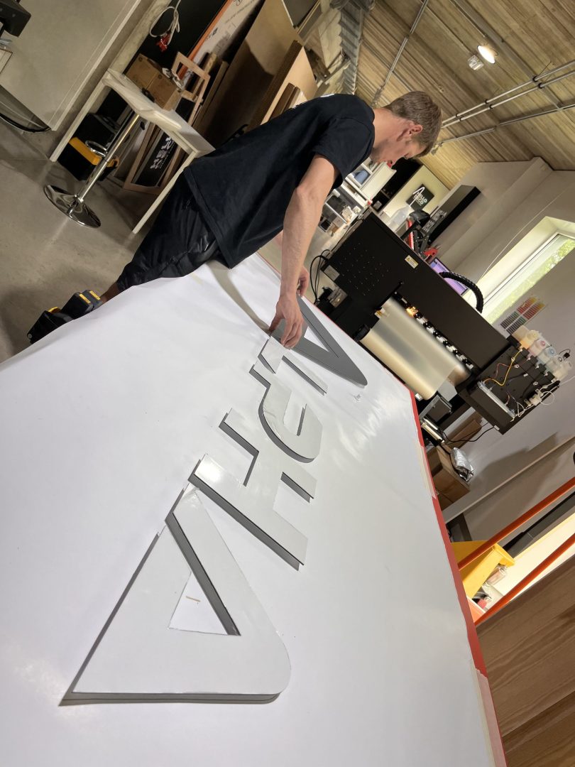 Ensuite, nous avons fabriqué un gabarit personnalisé, indispensable pour assurer une installation précise et harmonieuse sur la façade. Enfin, notre équipe a procédé à la pose sur site, en veillant à chaque détail pour un résultat final qui attire le regard et met en lumière l’image de l’entreprise.
