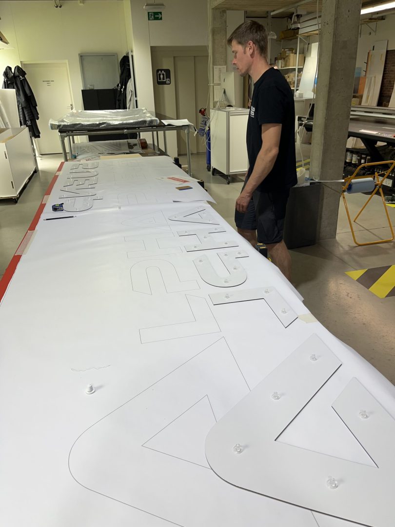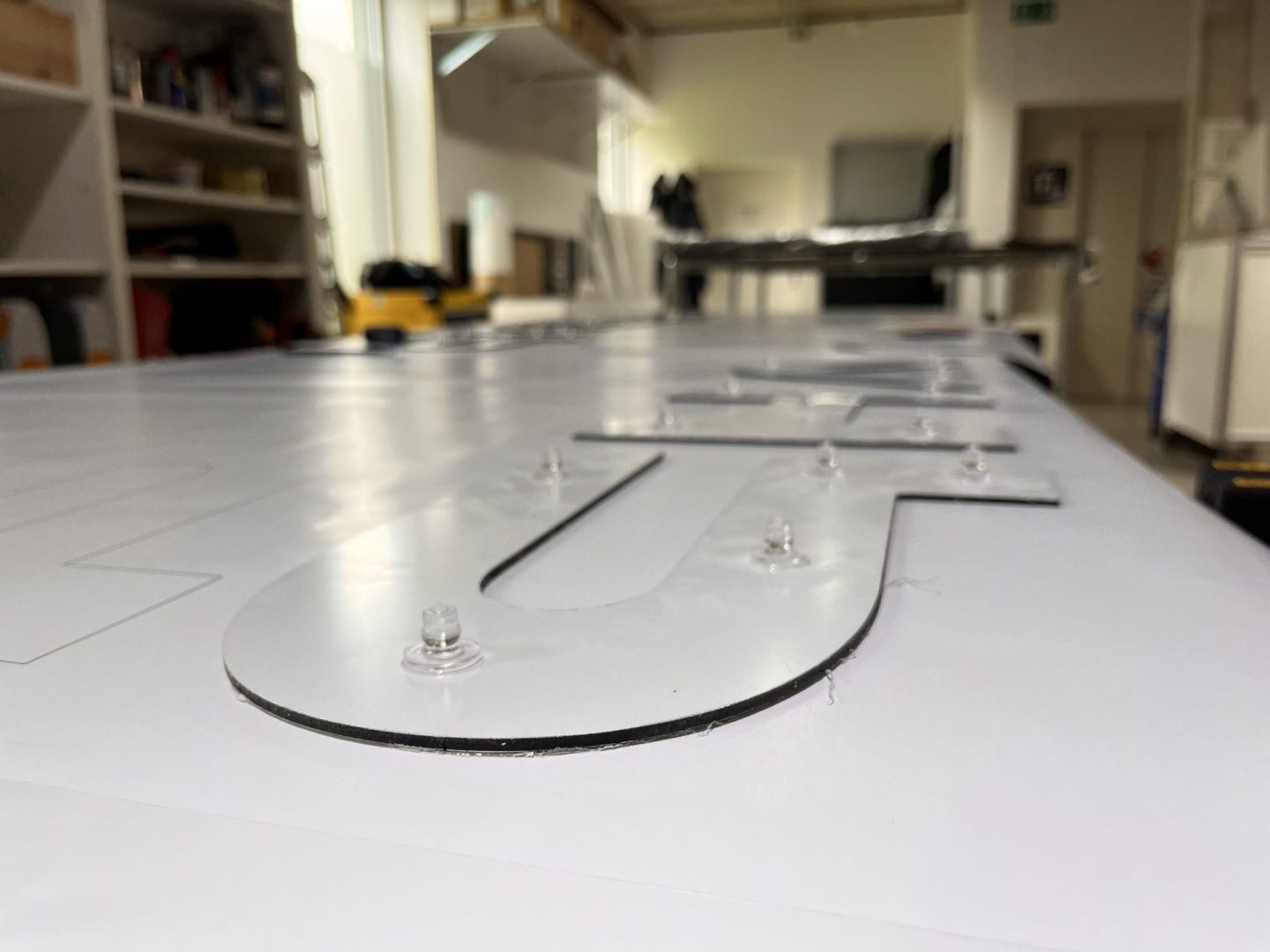 Le projet a débuté par la découpe de précision à la CNC dans un Alu Dibond, un matériau reconnu pour sa robustesse et sa légèreté. Une fois les éléments découpés, ils ont été soigneusement mis en peinture pour garantir un rendu esthétique impeccable et conforme à l’identité visuelle du client.