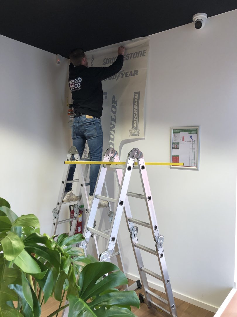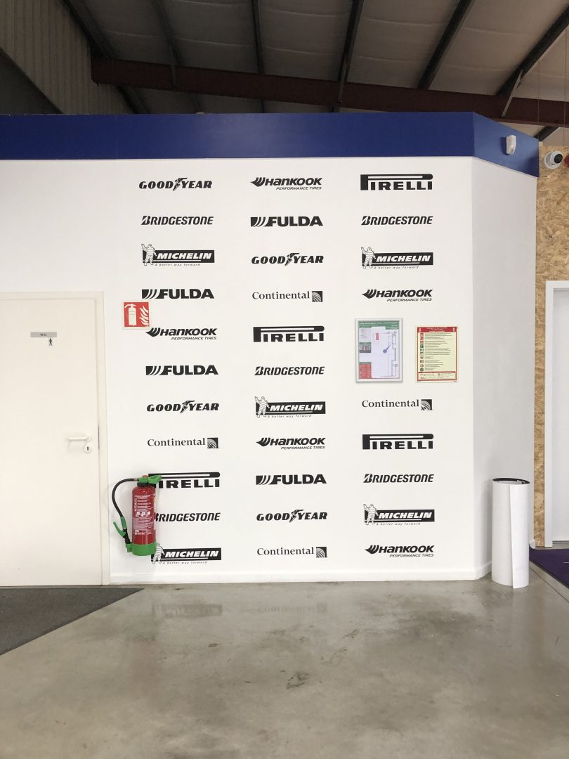 Nous avons conçu et posé un ensemble de vinyles noirs mats en découpe sur mesure, représentant différents logos de marques de pneus. Appliqués directement sur les murs, ces éléments graphiques renforcent l’identité de la marque tout en créant une ambiance professionnelle et dynamique dès l’accueil des visiteurs.