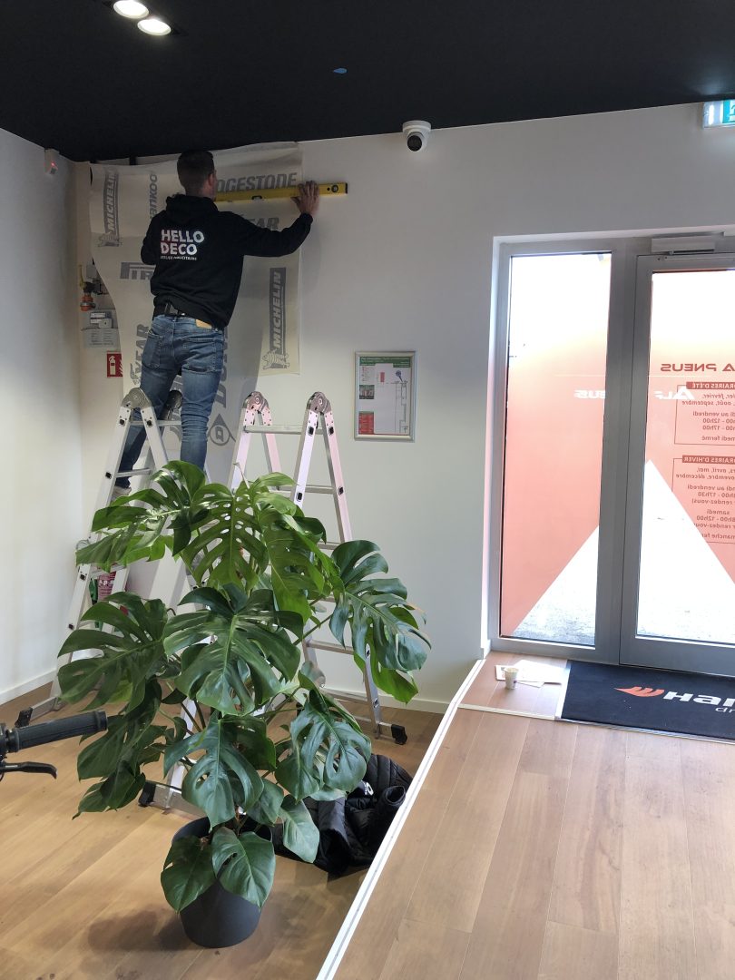 Hello Deco a accompagné AlphaPneus dans l’ensemble de son projet de signalétique, de la façade extérieure à la décoration intérieure.