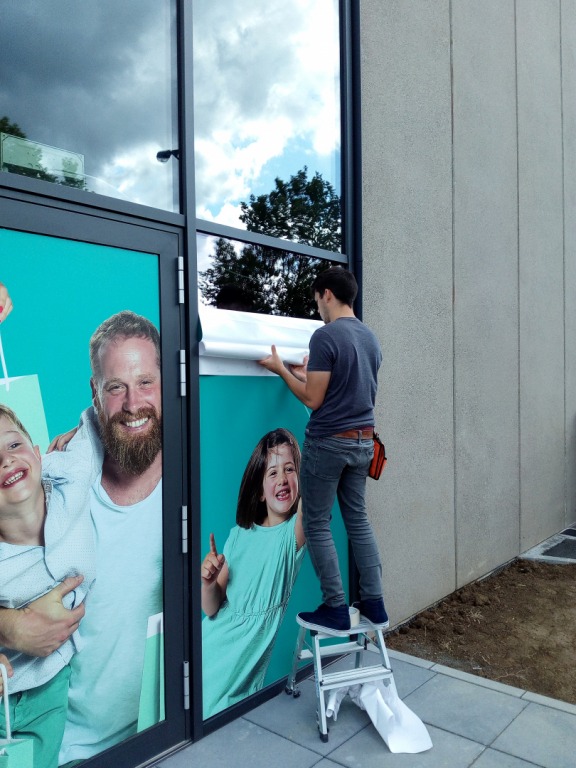 L’Atelier a produit et posé des stickers sur ces panneaux afin d’habiller les panneaux marins aux couleurs du centre et en faire un vrai espace de publicité !