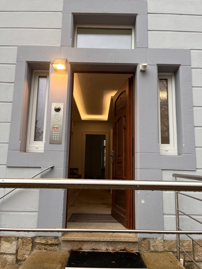 Pose d’un lettrage fraisé en acrylique noir mat, directement appliqué sur le linteau de la porte d’entrée pour un effet raffiné et moderne.