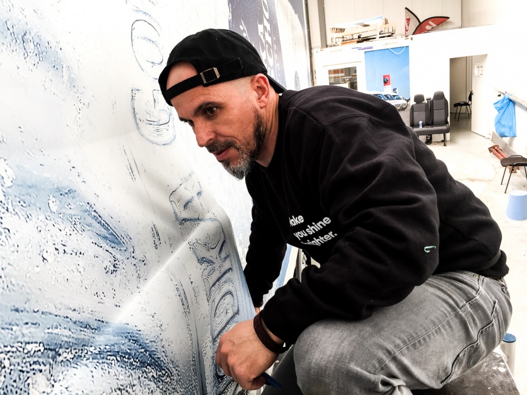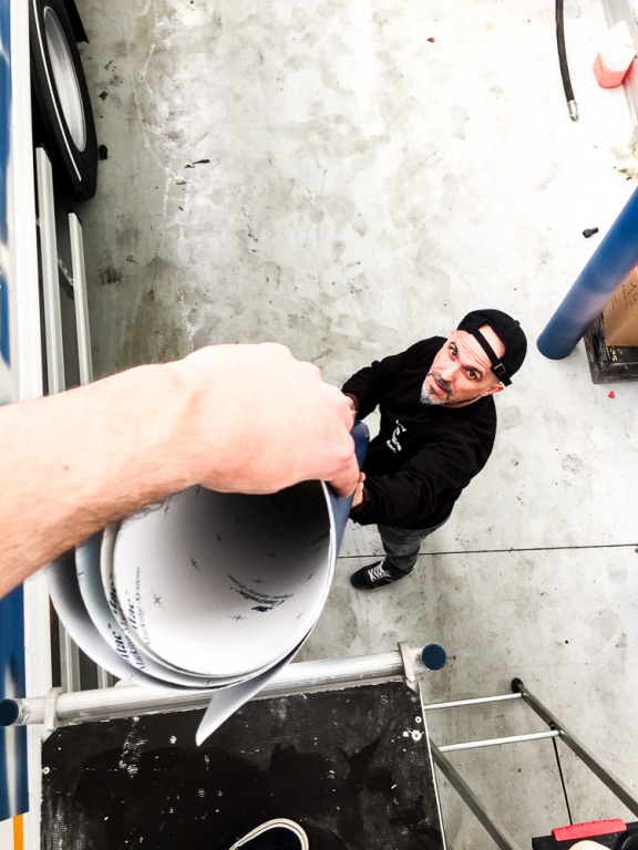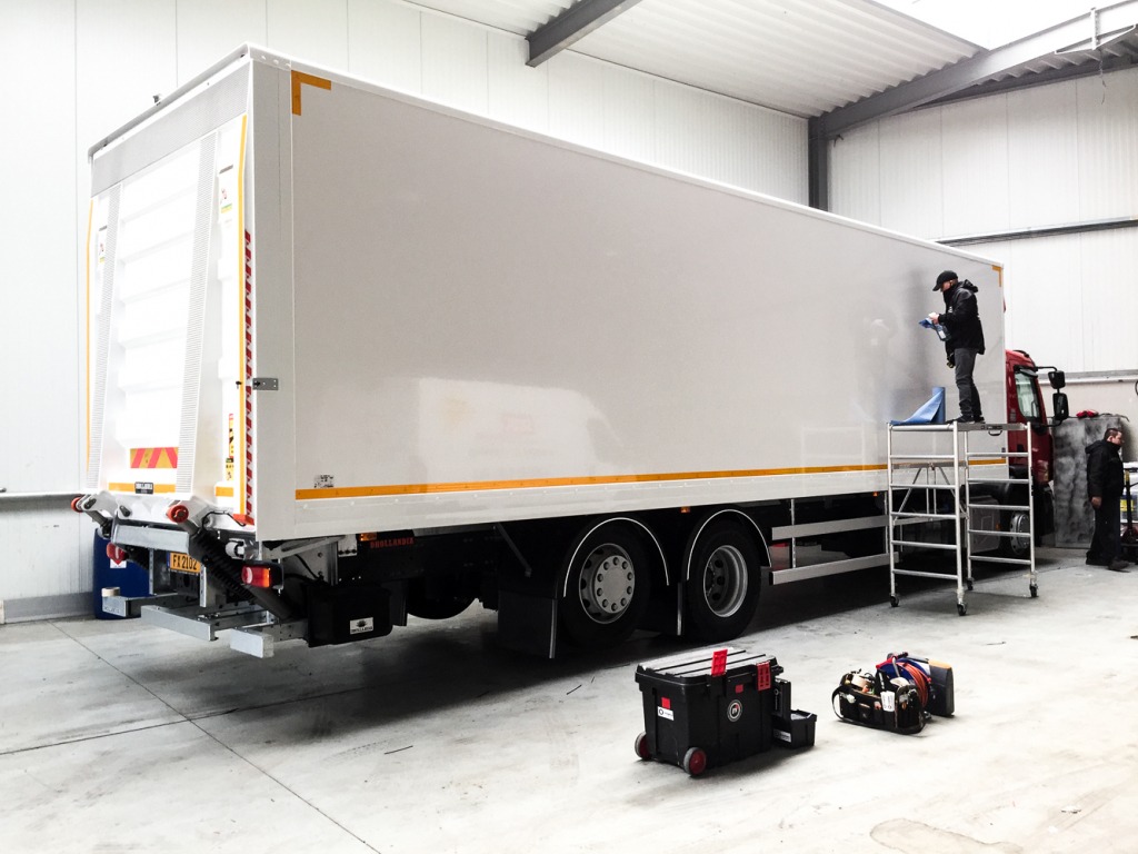 Nous avons pris rendez-vous avec notre client sur place pour lettrer les 4 camions en une seule fois. Un travail efficace dont nous sommes super fiers !