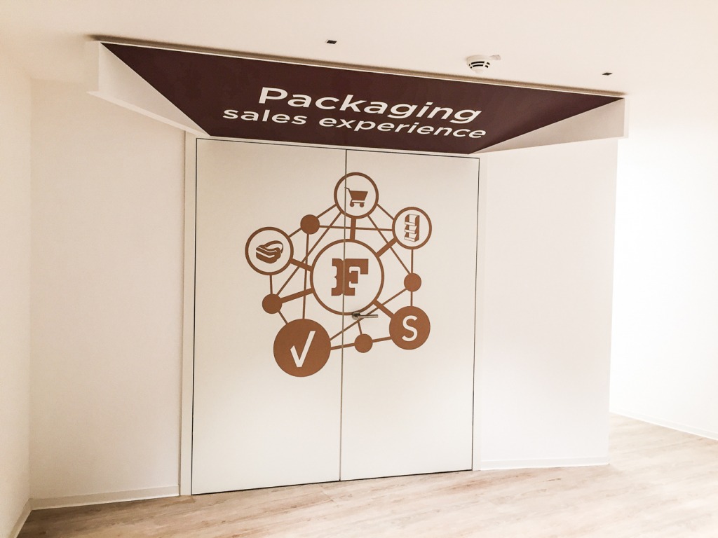 Pour ce projet, nous étions de retour à la Casa Ferrero après une première chouette collaboration ! Ici, l’entreprise nous a confié l’habillage des « casquettes » d’entrée ainsi que des portes des nouveaux showrooms.