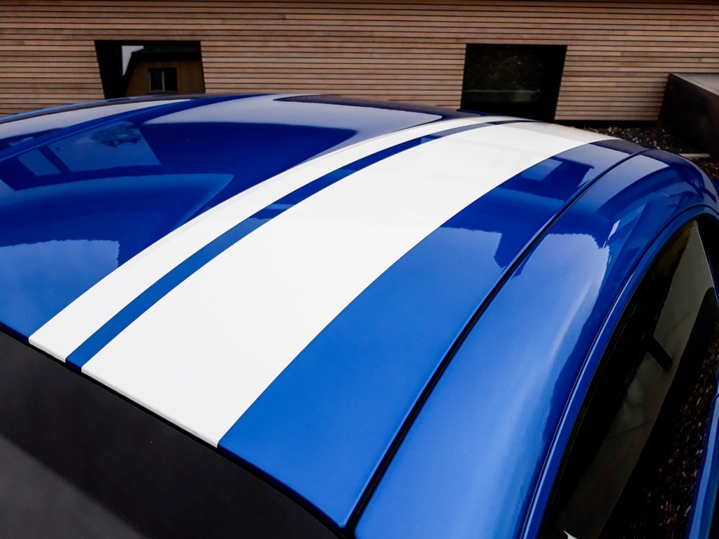 Les super-poseurs, super contents de voir une si belle voiture de près a produit et posé le lettrage, une bande blanche en vinyle brillant.