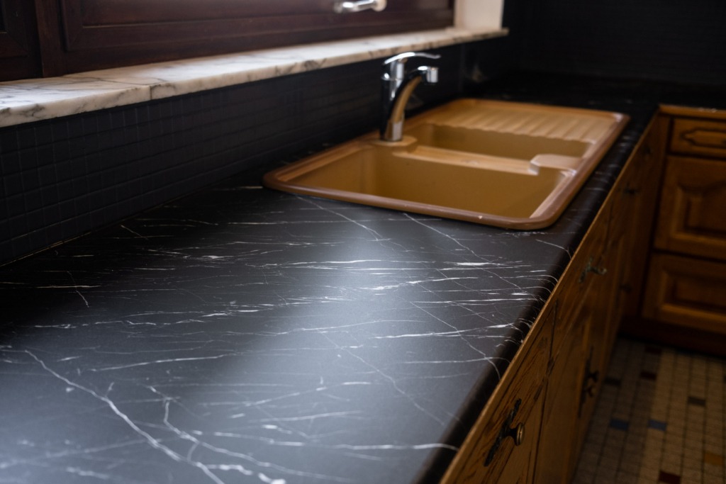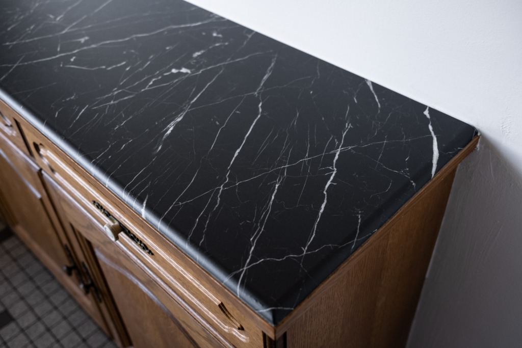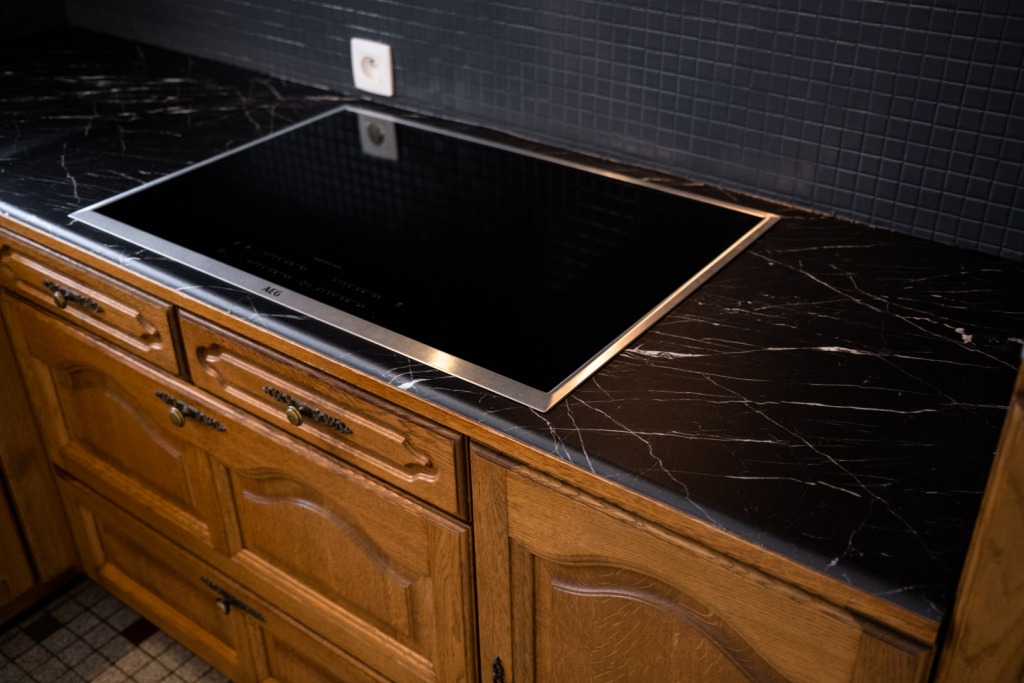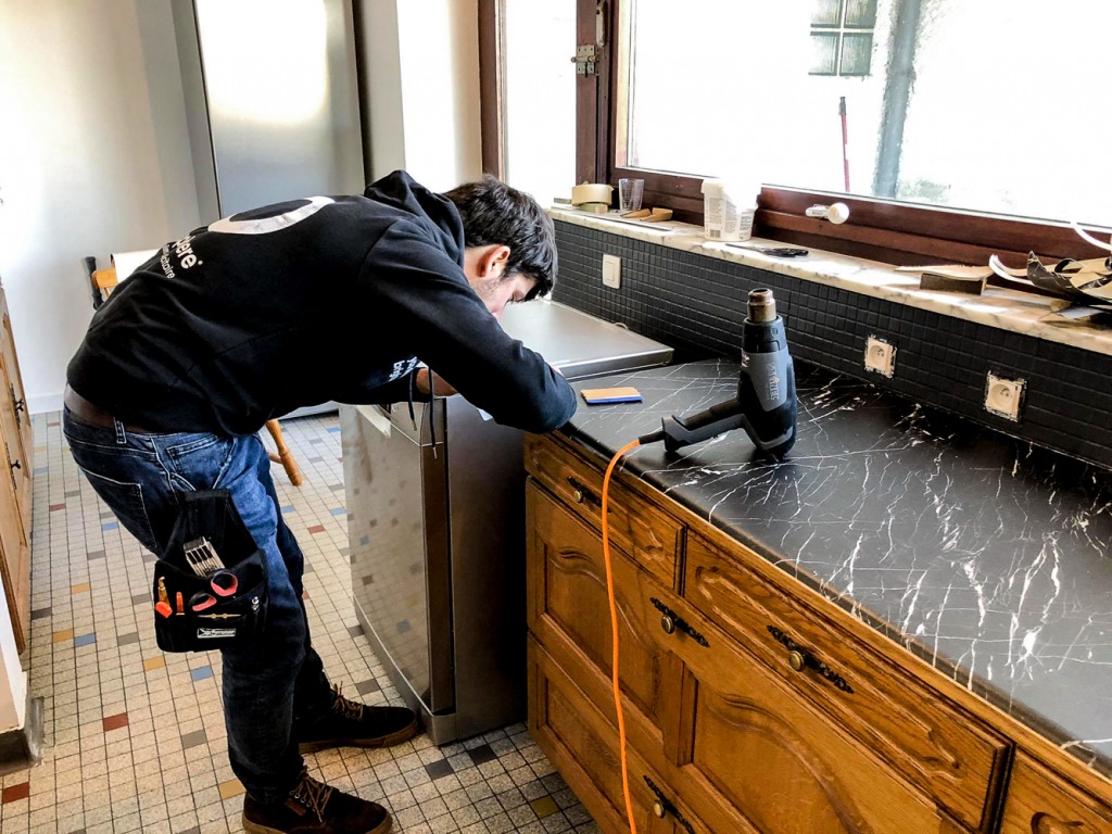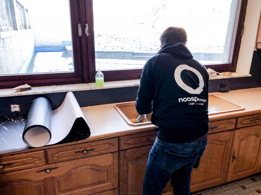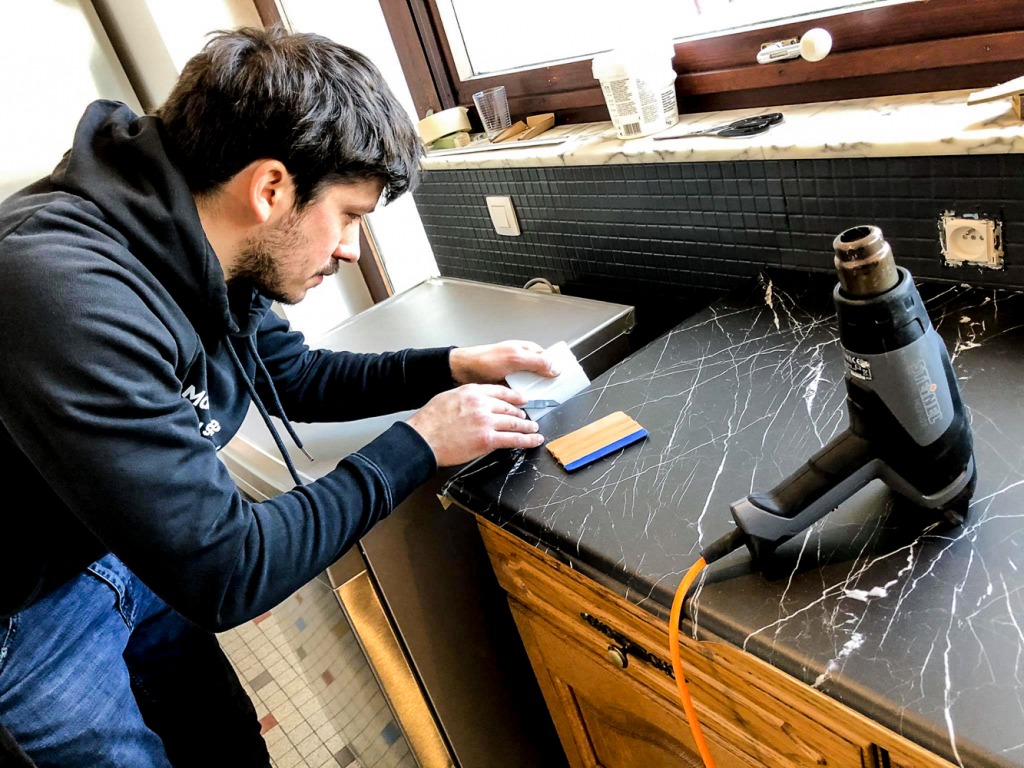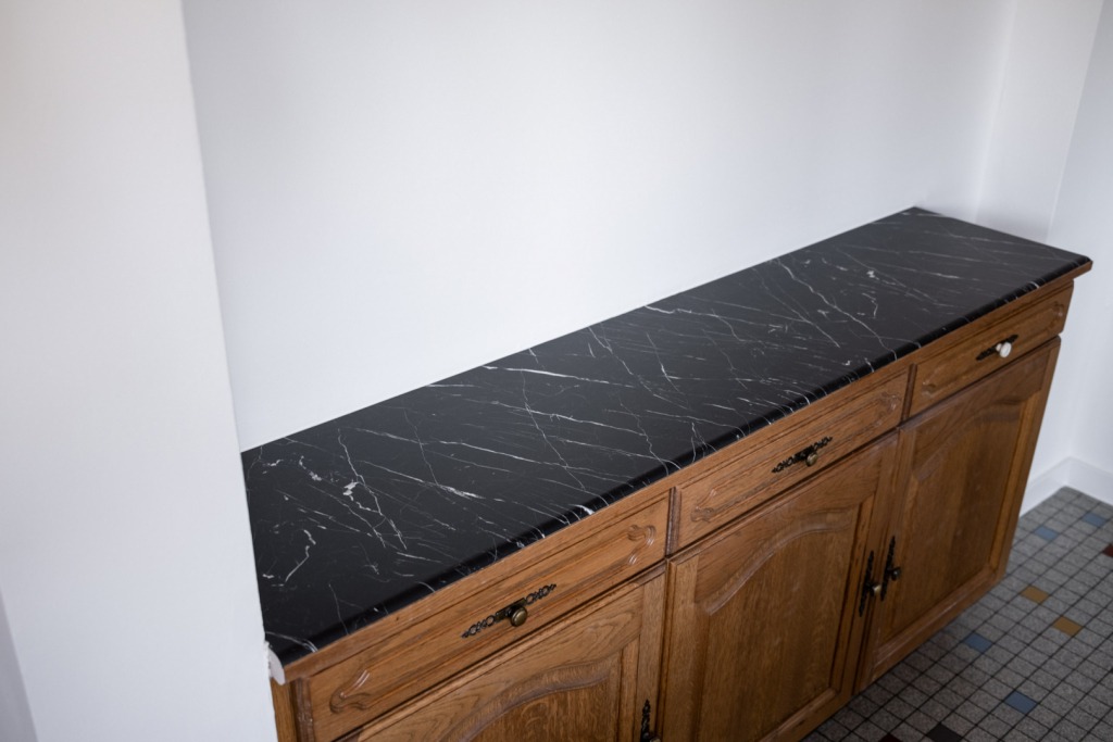 Faute de budget, il est parfois nécessaire de réfléchir autrement. C’est ce que notre cliente a fait : avant de mettre son bien en location, elle souhaitait donner un coup de neuf à sa cuisine. Nous lui avons proposé de recouvrir le plan de travail d’un vinyle.