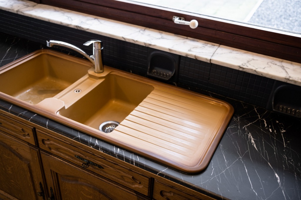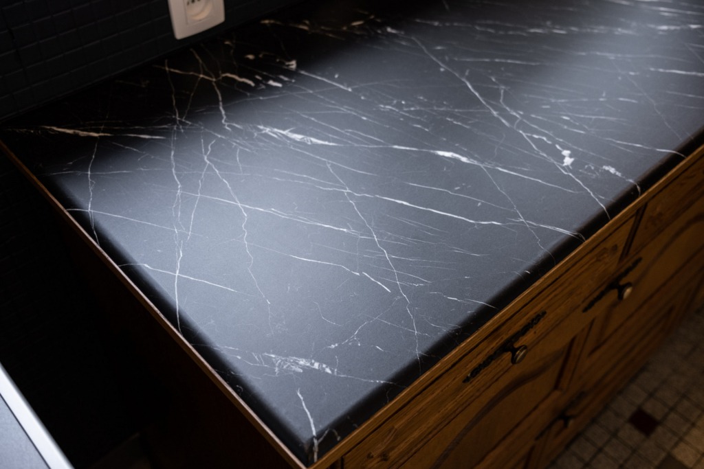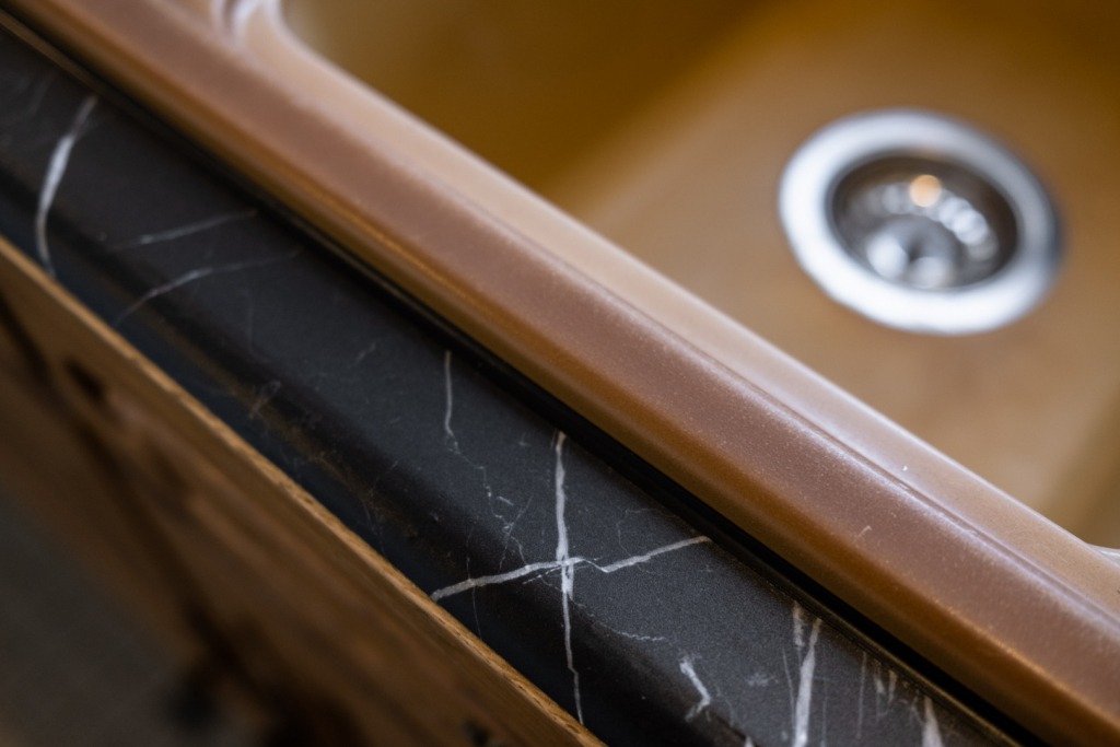 Le petit plus ? L’arrondi du bord du plan de travail, qui permet d’apporter du volume et d’augmenter l’impression d’avoir en face de soi un vrai plan de travail massif en pierre.