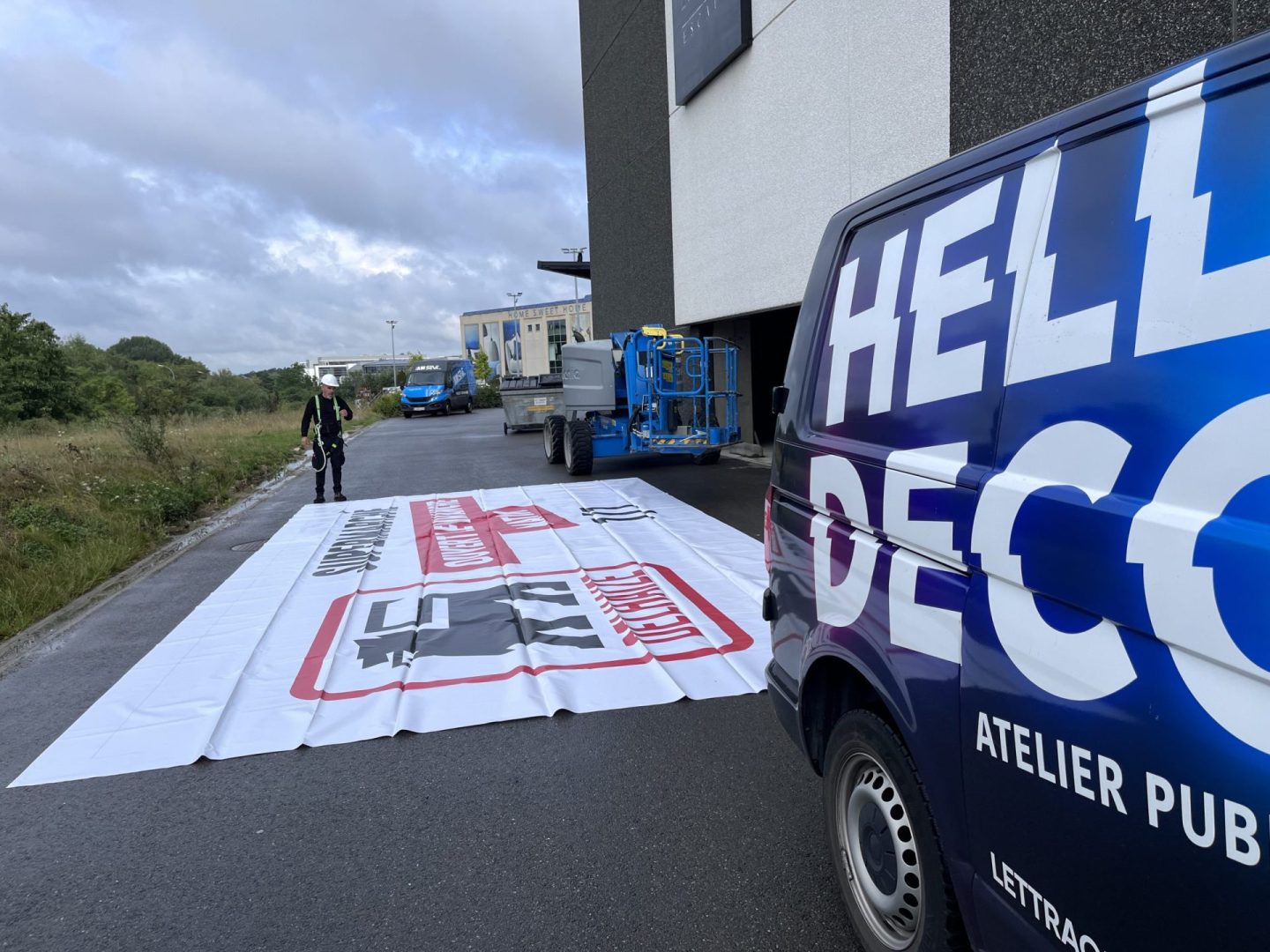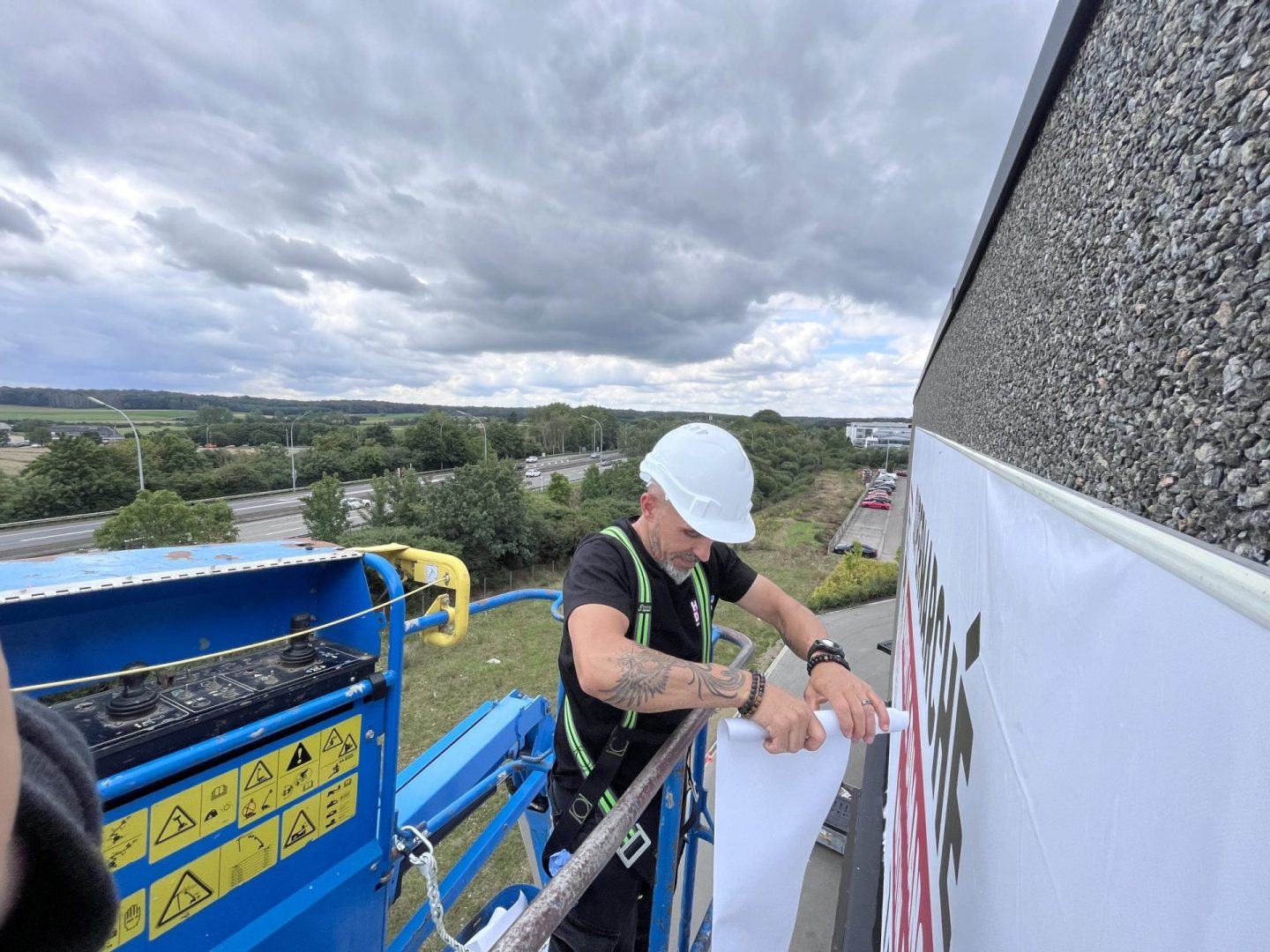 Grâce à une nacelle provenant de Mateco Luxembourg, Jérémy et Joao se sont élevés à plus de 15 mètres de hauteur pour l’installation de cette immense bâche mesurant 8,5 mètres sur 4 !