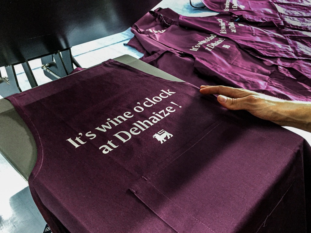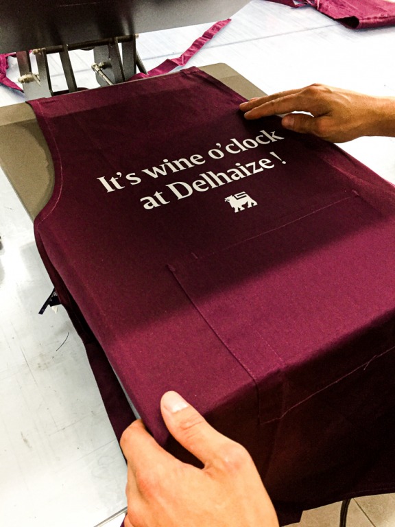 Nous avons floqué en un temps record un bon nombre de tabliers, avec un texte un peu fun, mais cohérent avec la campagne.