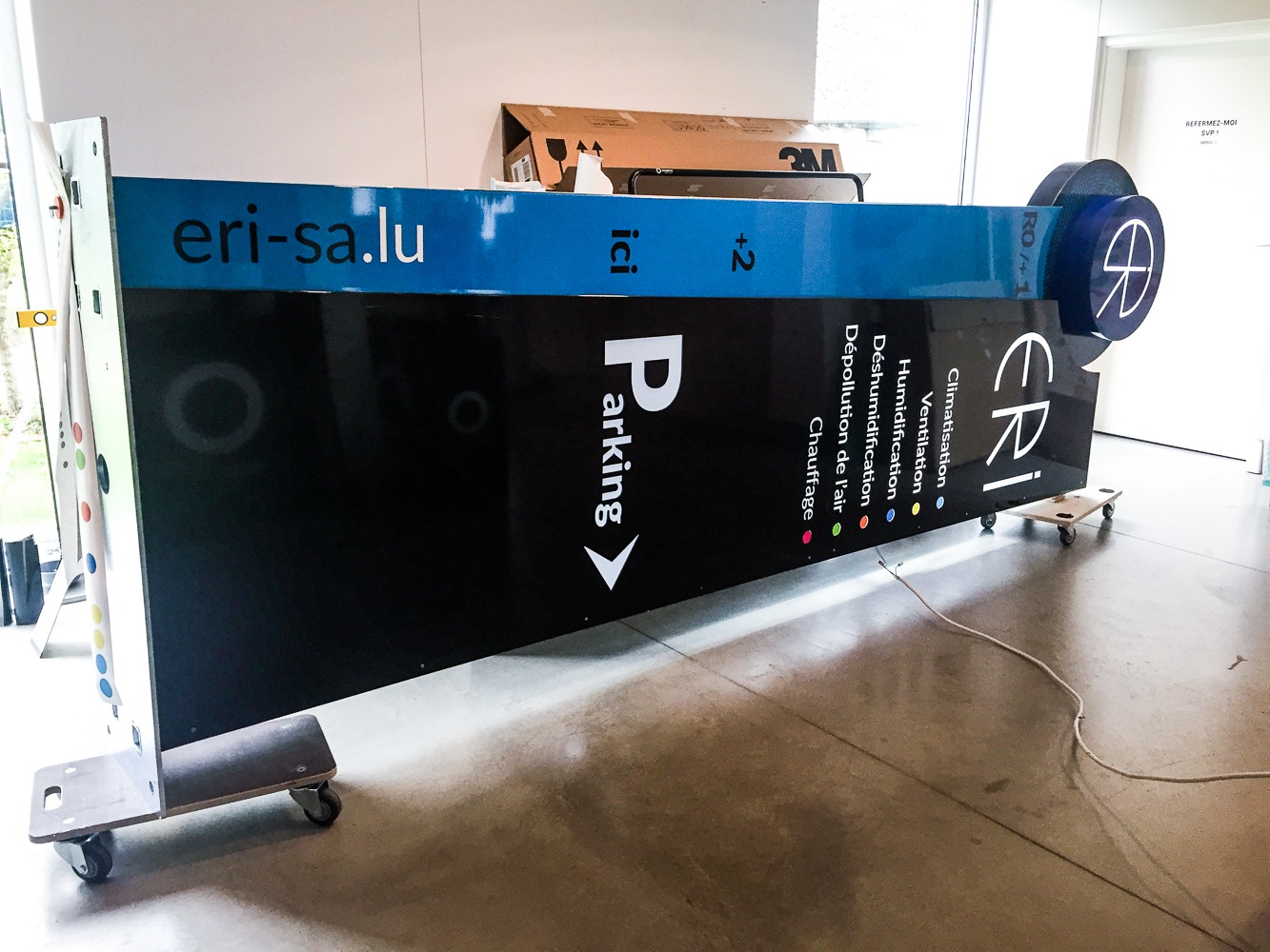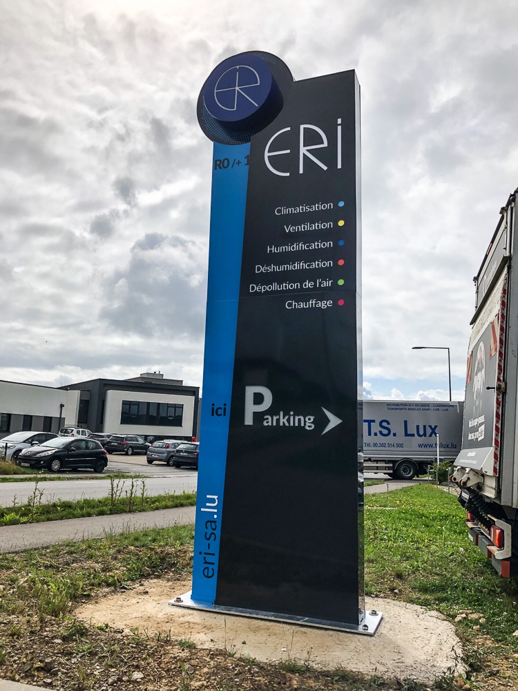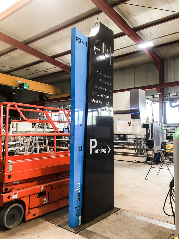 L’enseigne-totem de Eri Traitement de l’air est tombée suite aux grosses rafales de vent. L’équipe a alors contacté l’atelier pour les aider !