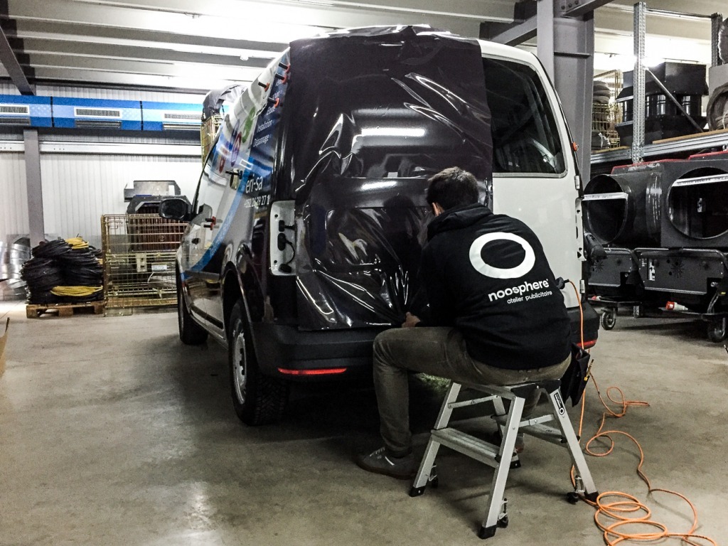 Tous nos lettrages sont sur-mesure : les super-poseurs ont mis en place un covering partiel du véhicule et une pose de vinyle micro-perforé sur les vitres arrières.