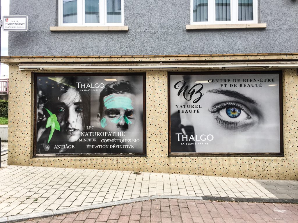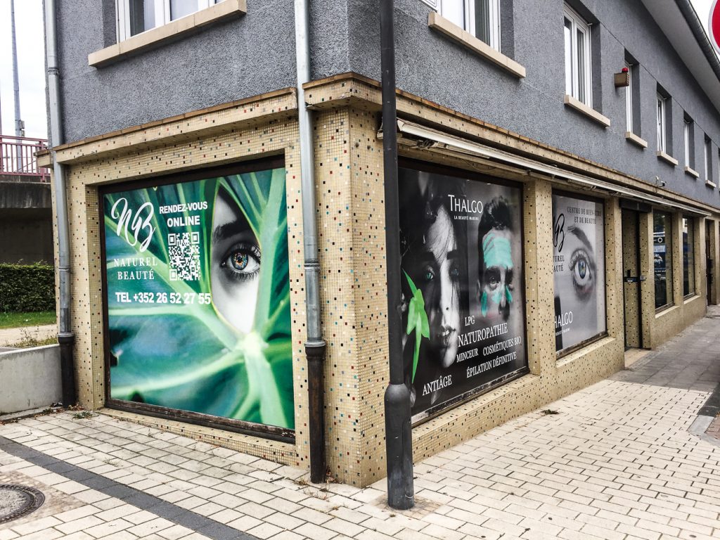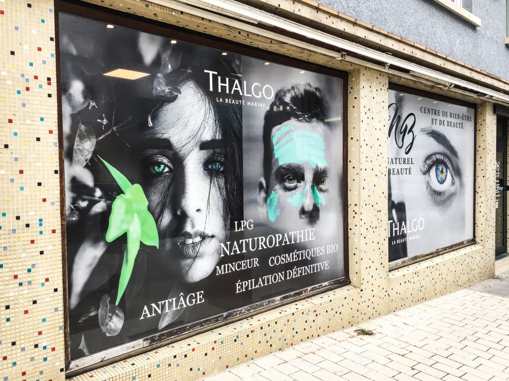 Nous avons lettré une zone de la vitrine en vinyle quadri afin d’occulter à 100% la visibilité tandis que les autres vitres sont lettrées en vinyle micro-perforé de chez ContraVision.