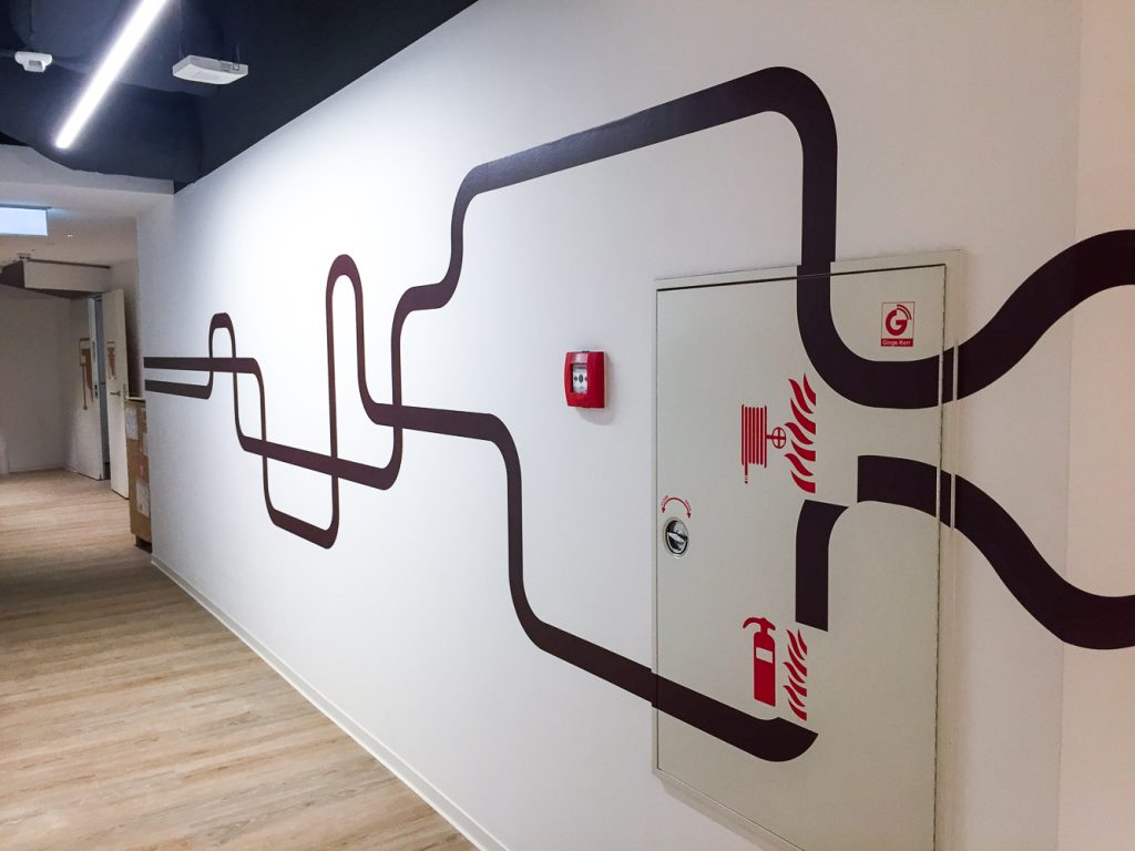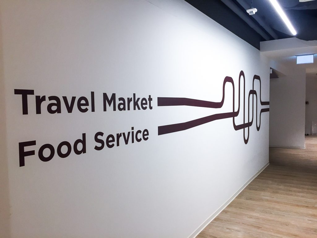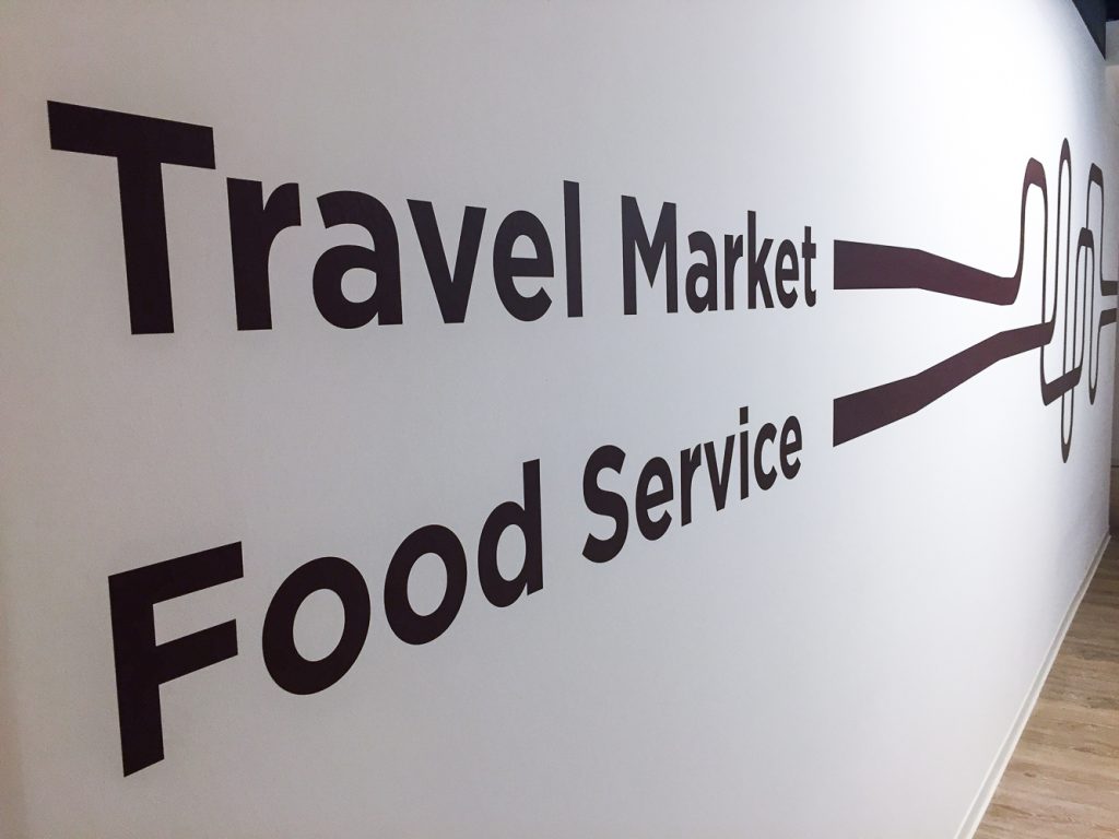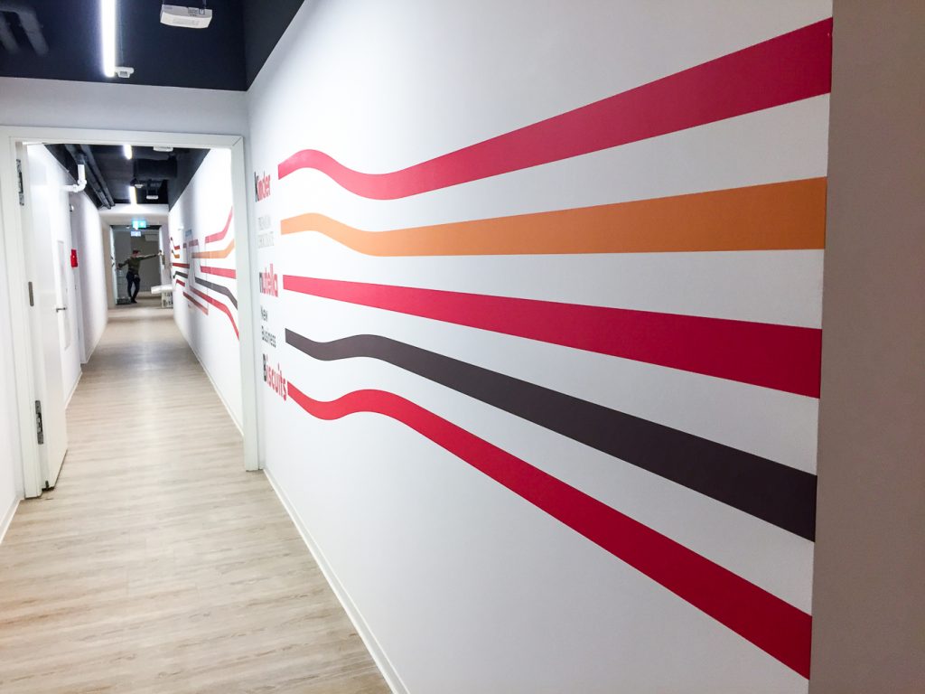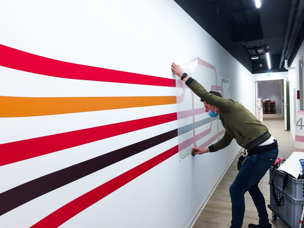 Nous avons réalisé, produit et mis en place un vinyle adhésif imprimé quadri pour respecter les couleurs de la marque, une lamination mate avec application murale, des panneaux de présentation produit sur pied et la pose d’un tapis rouge pour l’inauguration. En bref, un full package qu’on adore !