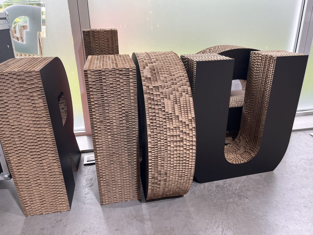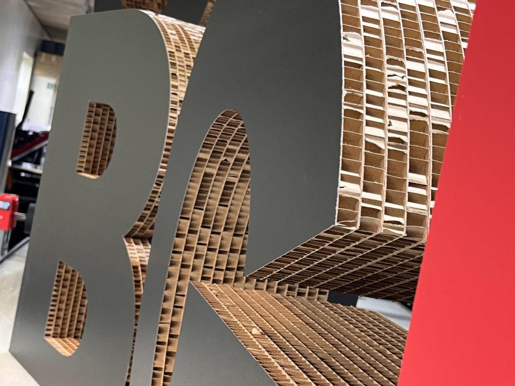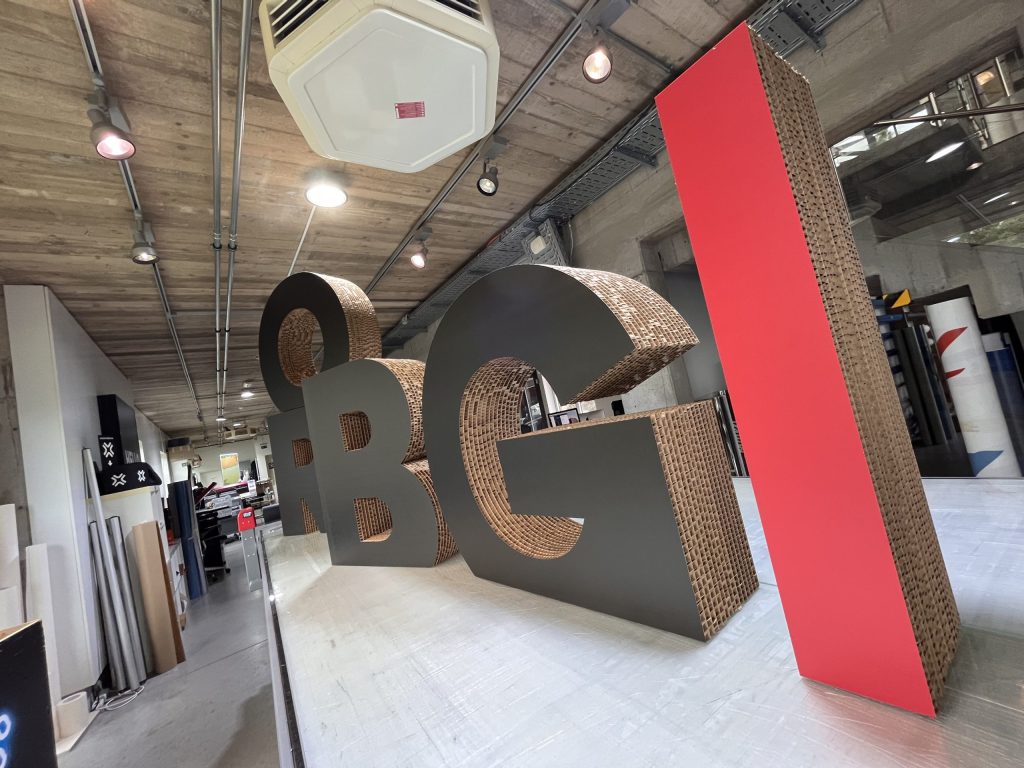 Récemment, nous avons réalisé un logo auto-portant imprimé en quadrichromie UV sur du carton Beelite 16 mm, parfait pour marquer les esprits lors d’un événement.