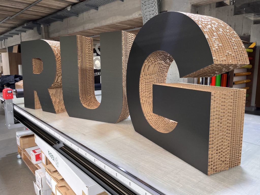 Grâce à notre Mimaki et une découpe précise via notre CNC, nous avons assemblé plusieurs couches de carton pour une structure solide, adaptée à l’intérieur comme à l’extérieur. Résultat : un support visuel qui allie qualité, durabilité et esthétique.