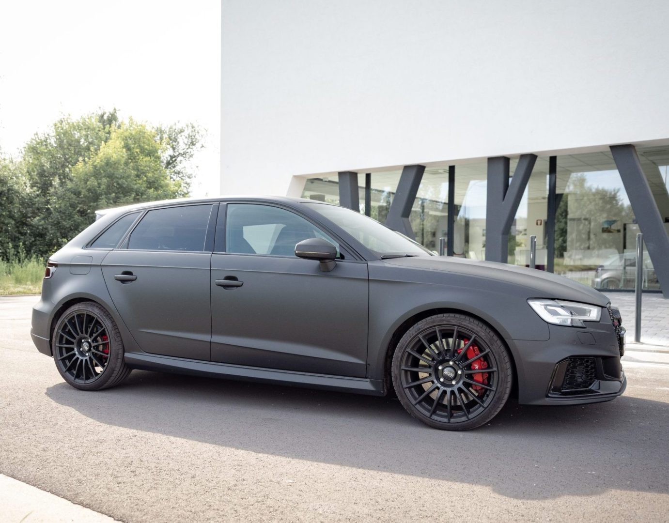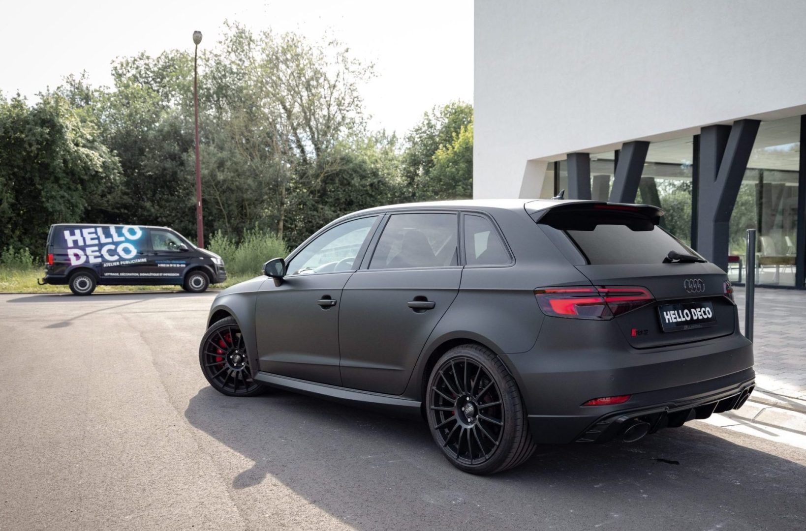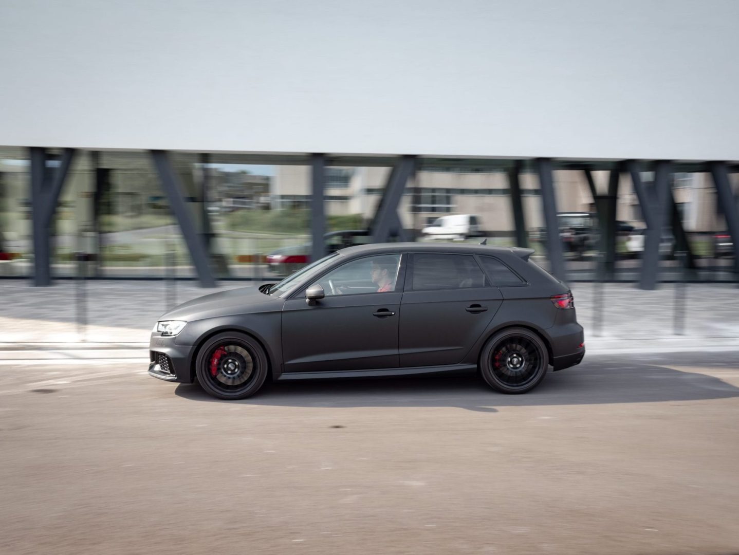 Cette Audi RS3 est passée en noir mat et noir brillant après démontage partiel des pièces de carrosserie.