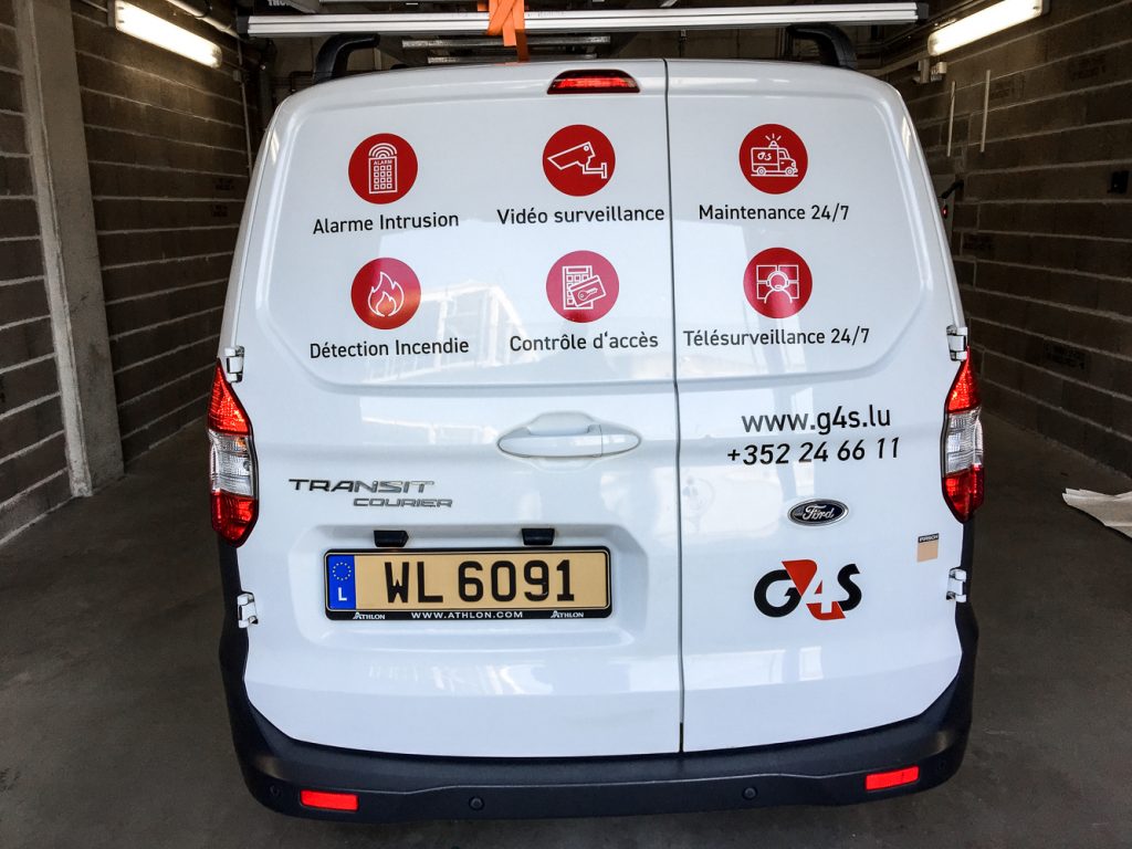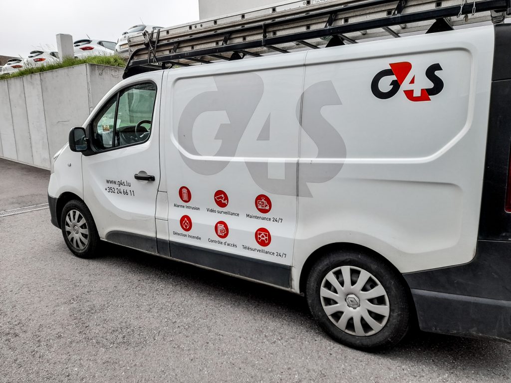 G4S Luxembourg souhaitait adapter les lettrages existant sur sa flotte de véhicules en spécifiant ses différentes activités via des pictogrammes.