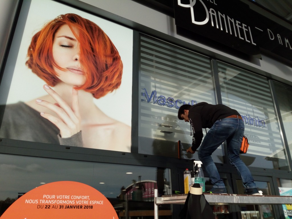 Avec une impression grand format d’un sticker et une installation sur place.