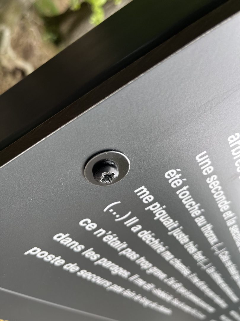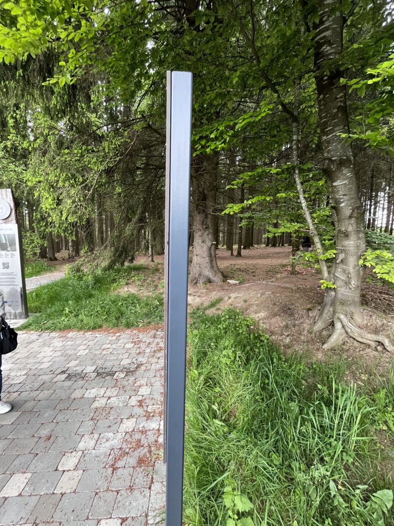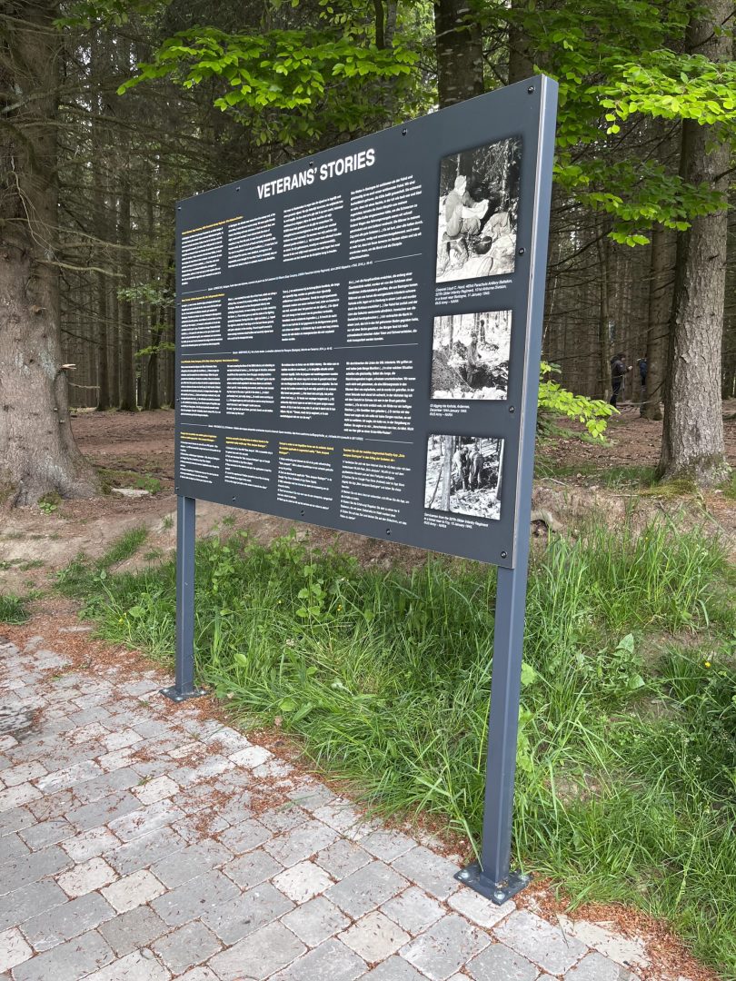 Un panneau conçu et dédié aux soldats américains au Bois Jacques à Bastogne. Ce panneau, qui allie structure en acier thermolaqué et panneau en HPL Trespa, a été conçu dans notre atelier et installé par nos soins, suivant le cahier des charges de Idelux.