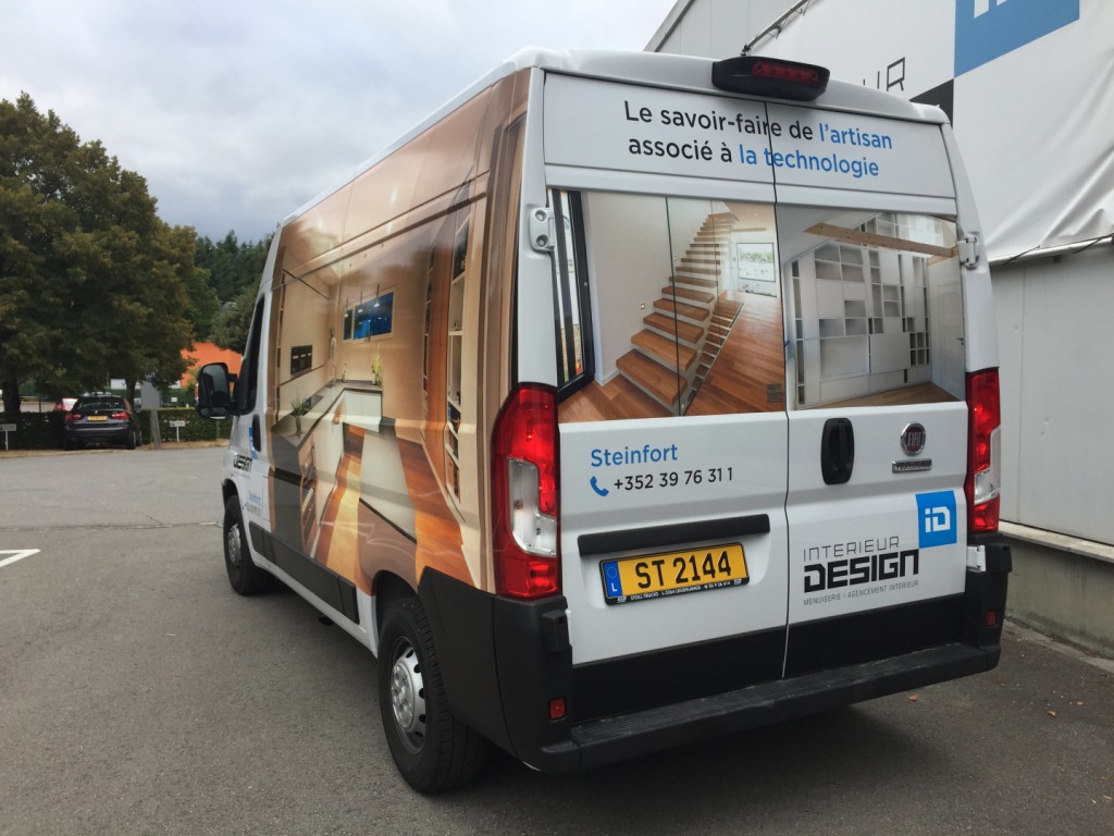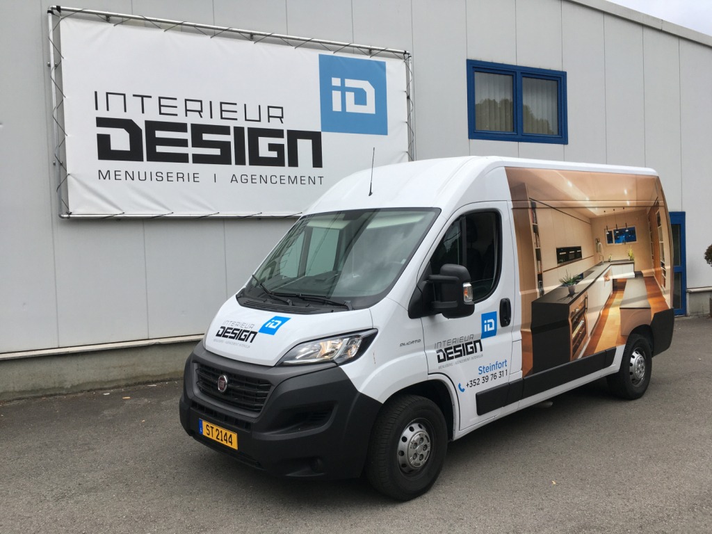 Notre équipe de super-poseurs a proposé à Intérieur Design une impression grand format pour un max de visibilité, avec covering presque complet des flancs des camionnettes.
