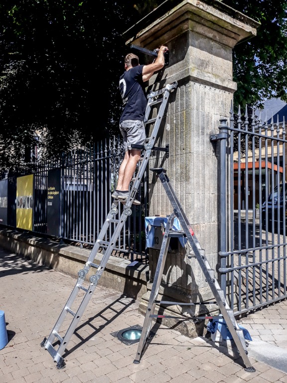 Nous avons produit des potences sur mesure, thermo laquées en noir mat. Ensuite, nous avons posé les panneaux publicitaires à la verticale.