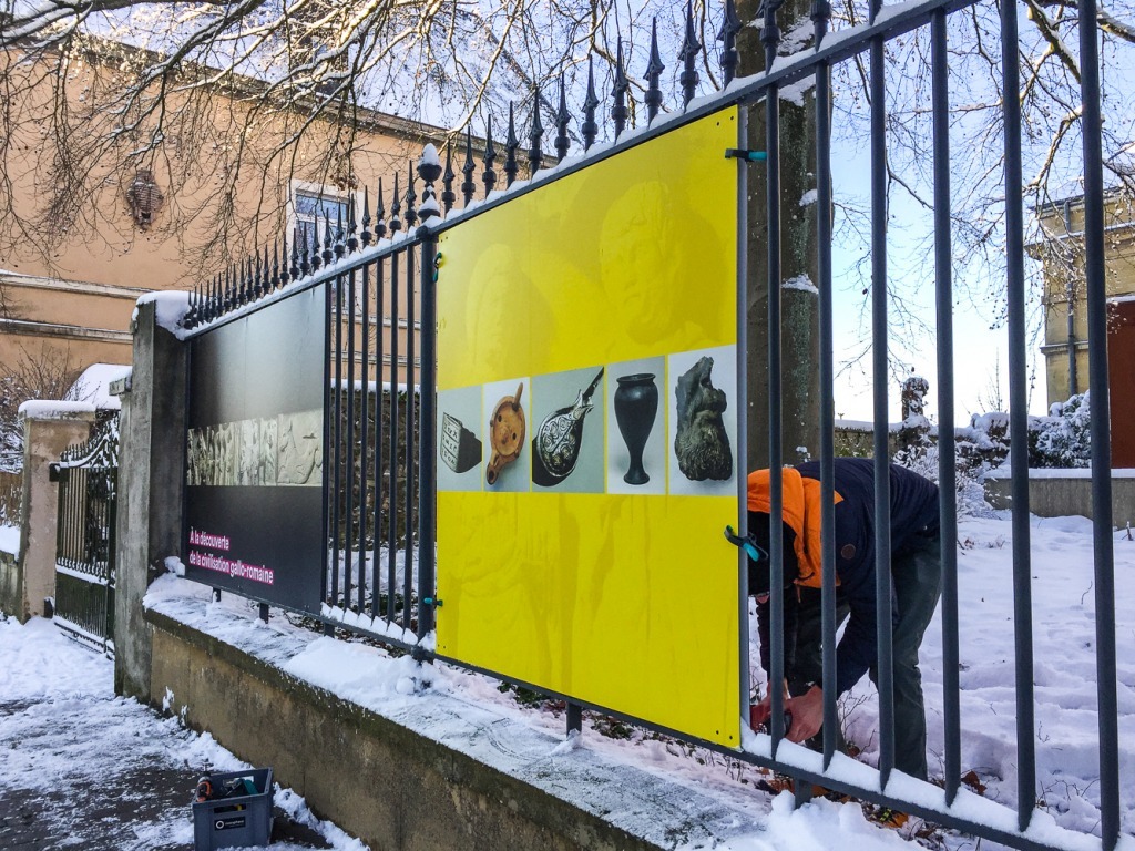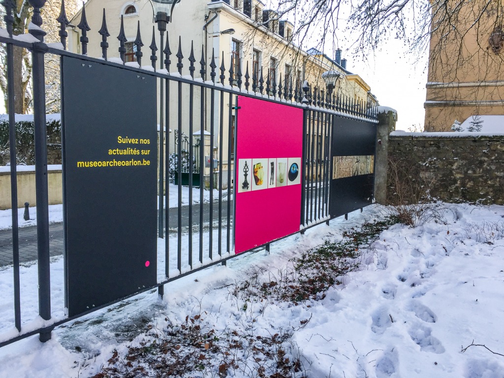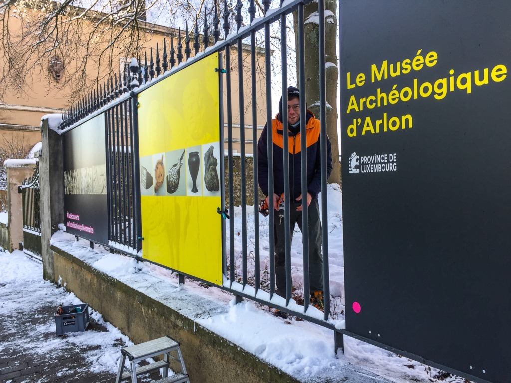 Après une première mission en été 2021, notre équipe est retournée sur les lieux, à savoir le Musée d’Arlon. L’agence Intrépide Studio nous a confié la deuxième partie de la mission : la production et l’installation de nouveaux panneaux au verso.