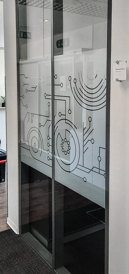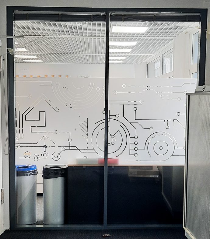 Nous nous sommes rendus dans leurs bureaux à Luxembourg-Kirchberg pour l’application de ce vinyle sablé de type Mactac Frosted après réception du fichier graphique.