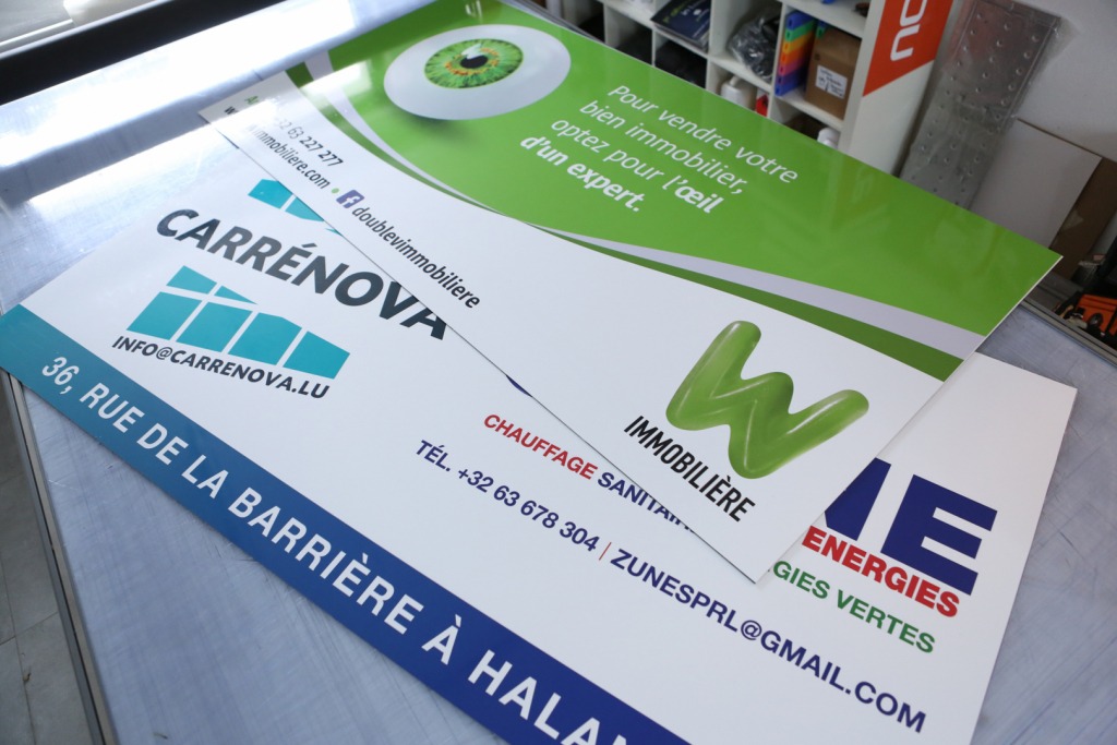 Notre équipe a produit des panneaux découpés au format, en contre-collage de vinyle au laminé brillant.