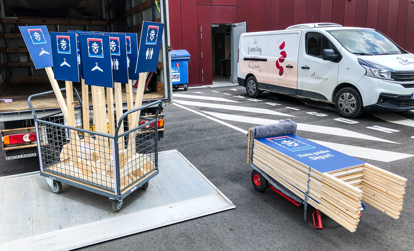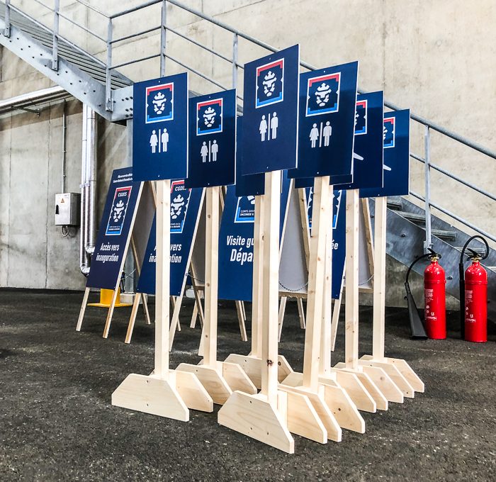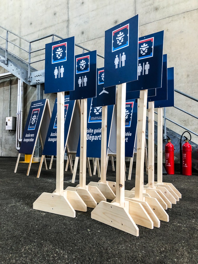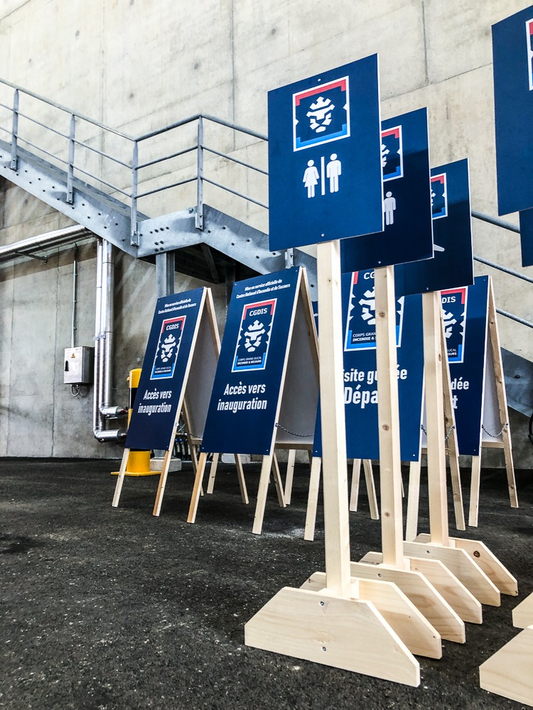 Signalétique réalisée et livrée par notre équipe dans le cadre d’un événement au Centre National d’Incendie et de Secours – Cloche d’Or. L’agence événementielle Lemon Event Support a fait appel à nos services pour la construction sur mesure de ces supports en bois et panneaux en PVC 5 mm avec impression vinyle contre-collé.