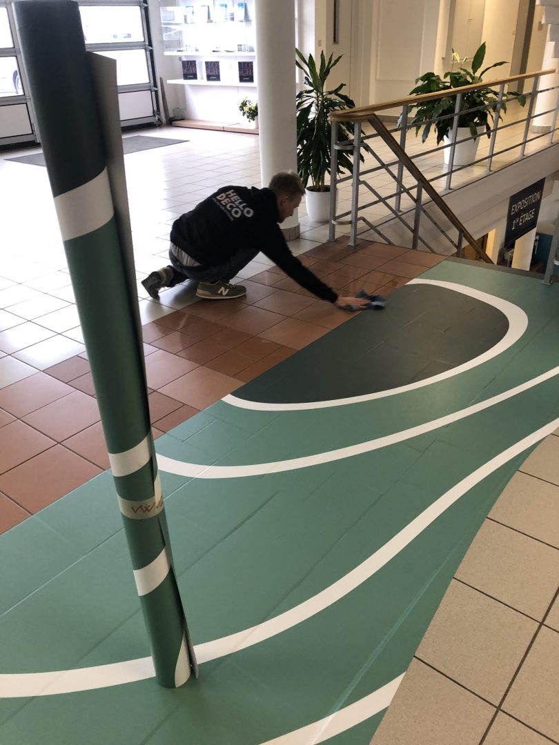 L’objectif était d’intégrer harmonieusement cette signalétique au sol afin de renforcer l’identité visuelle du showroom et d’offrir une expérience immersive aux visiteurs. La pose a été réalisée avec une grande précision, garantissant un rendu esthétique impeccable et une parfaite adhésion aux supports.