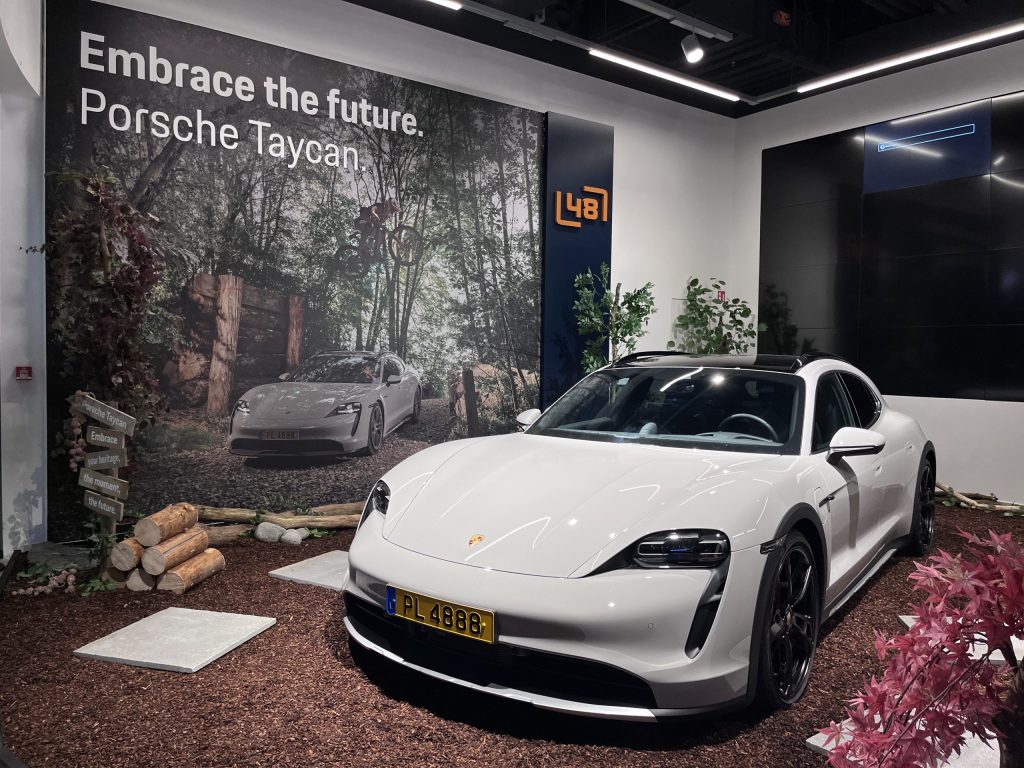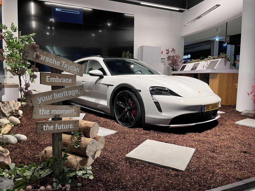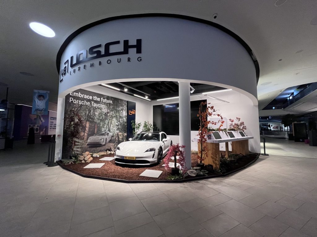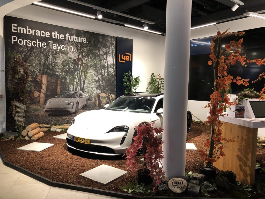 Reproduction d’un décor forestier au centre commercial Cloche d’Or à l’occasion de la campagne du nouveau Taycan, le nouveau bijou 100% électrique de Porsche.