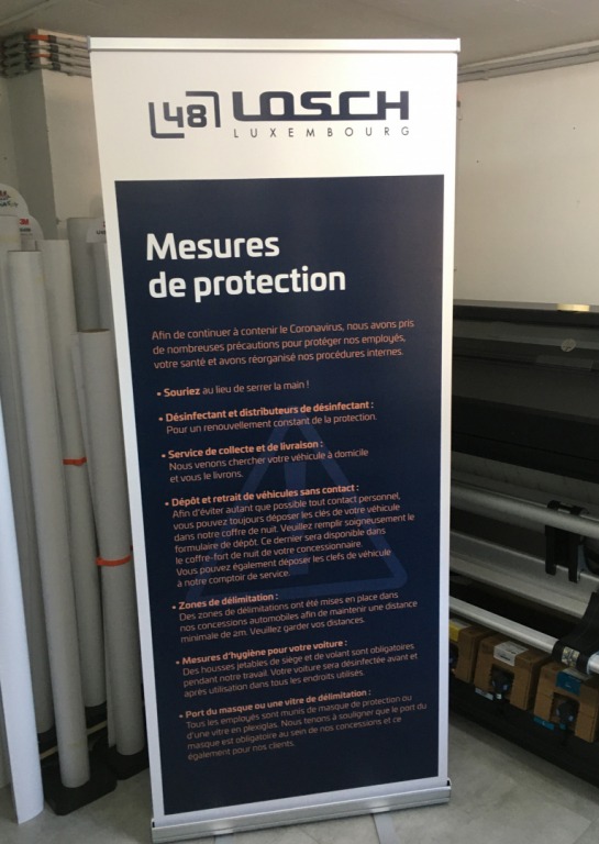 Afin de s’adapter au plus vite à l’actualité, les concessions Losch ont fait appel à l’équipe pour la production de matériel POS mentionnant les nouvelles normes de sécurité.