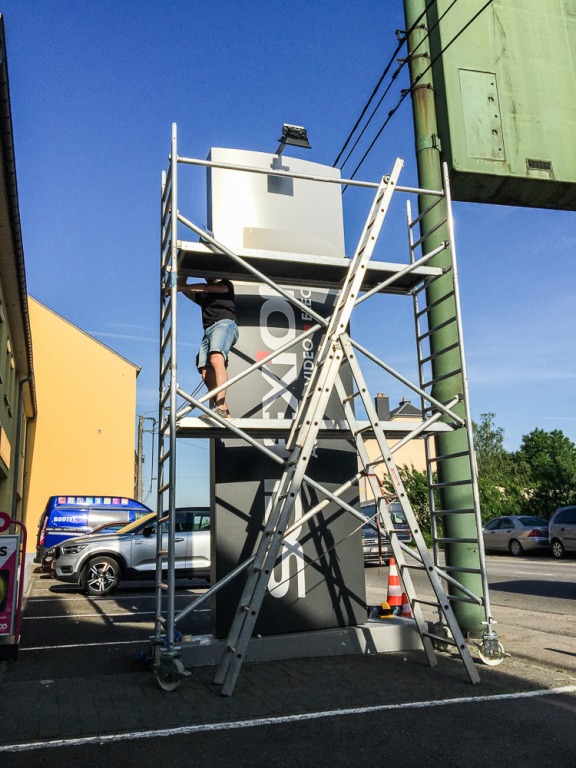 Ni une ni deux, nous avons produit un nouveau design et avons posé le sticker grand format sur l’ancien totem. Et voilà, il est de nouveau comme neuf !