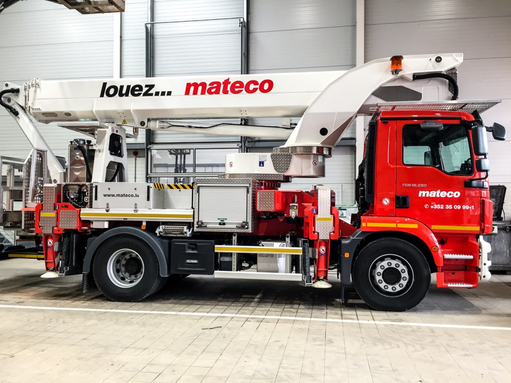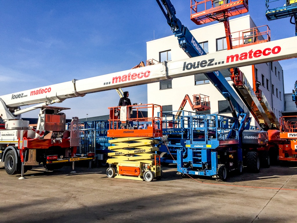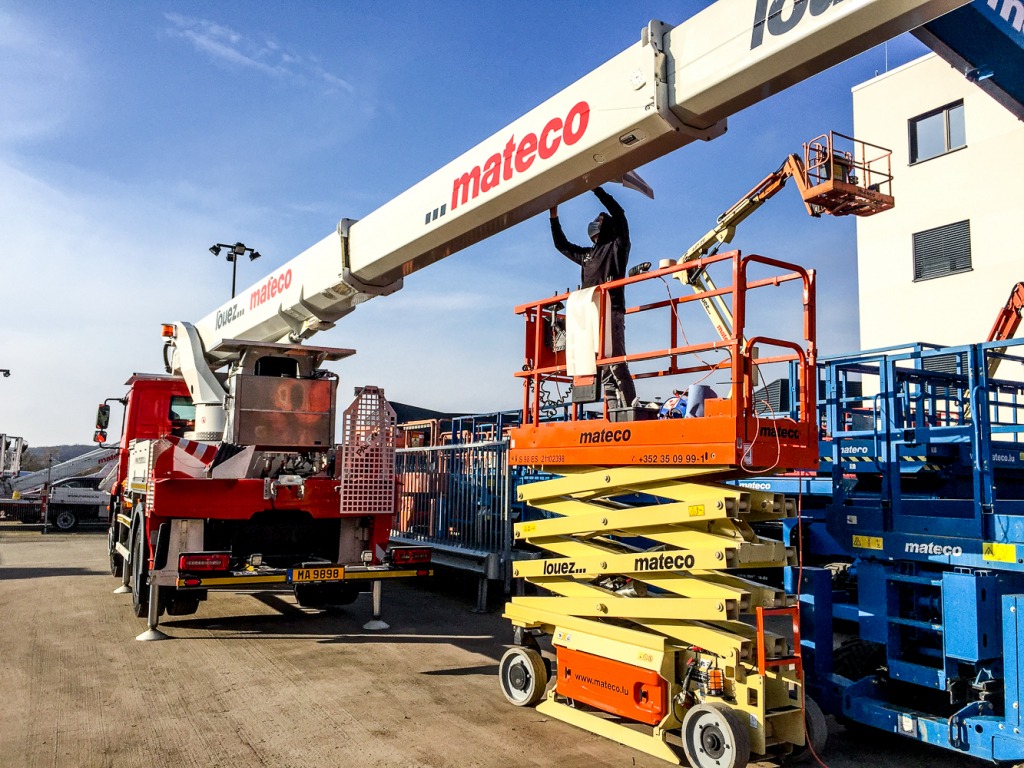 L’équipe des super-poseurs a produit et installé le lettrage aux couleurs de l’entreprise, installée sur les élévateurs Mateco. Pratique !