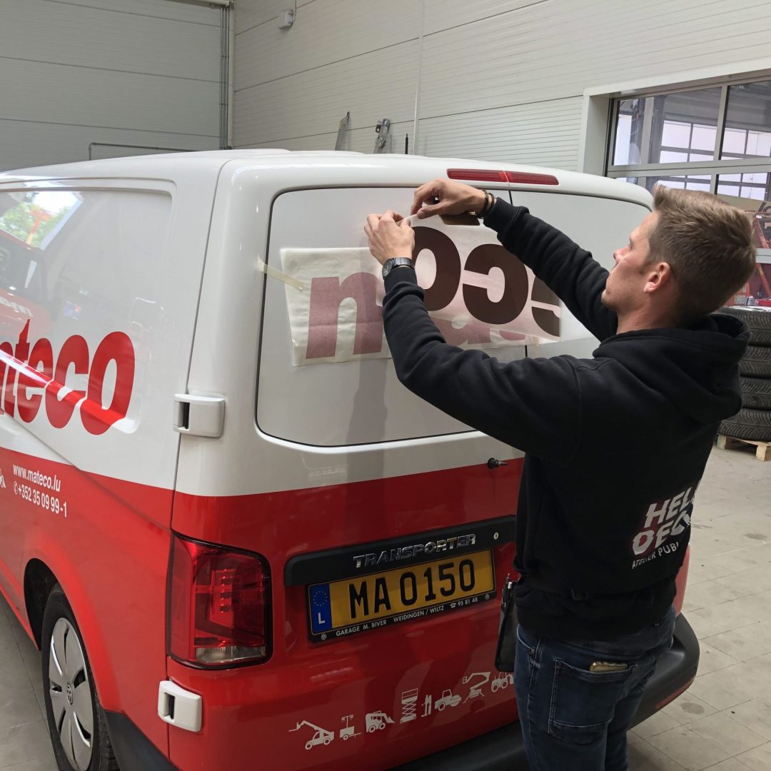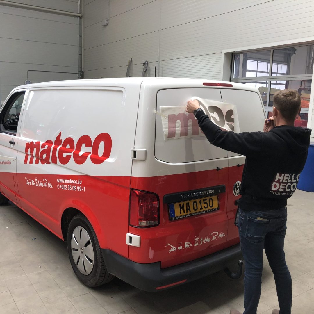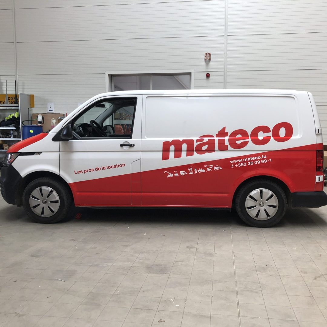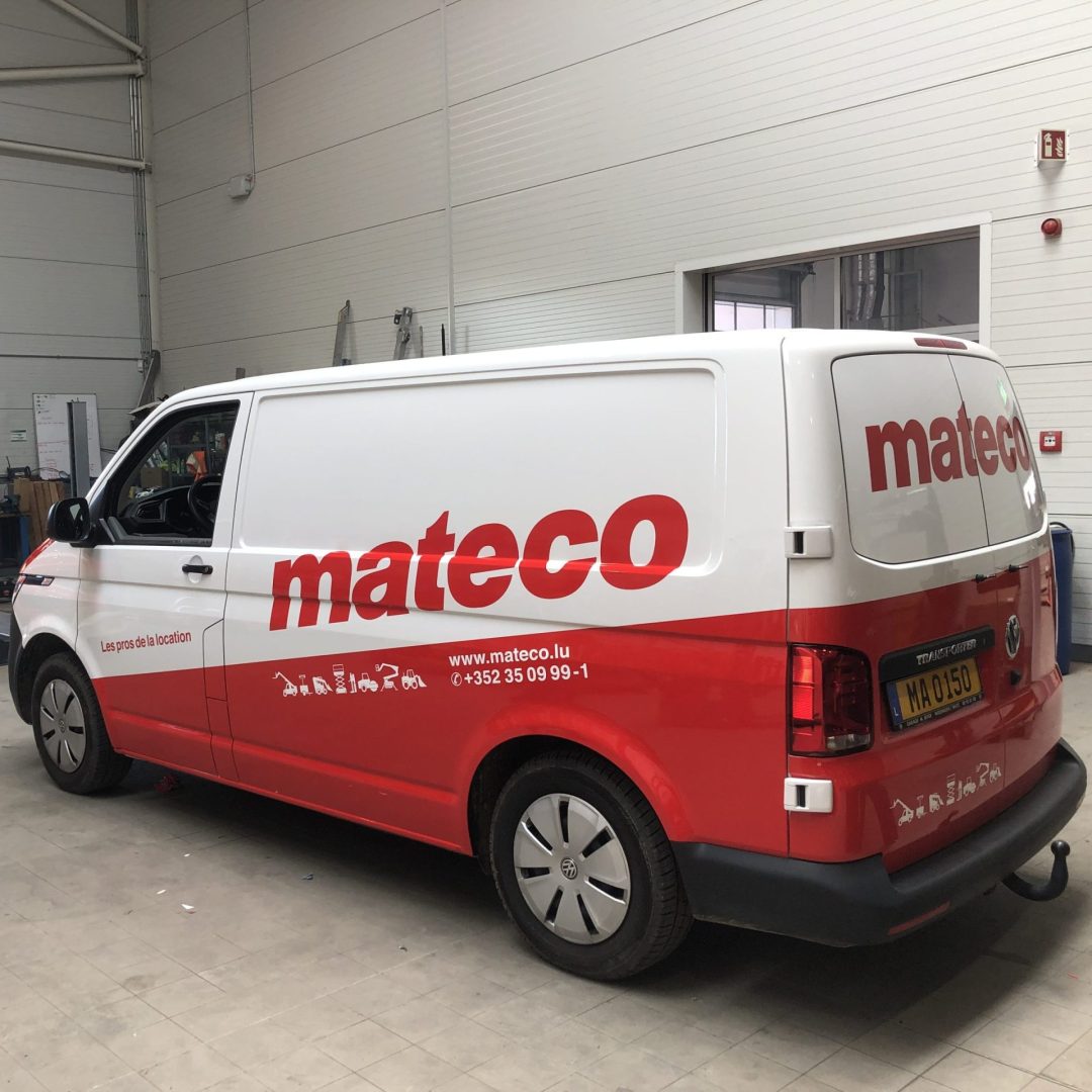 Réalisation ici d’un covering et pose de lettrage sur un VW transporteur aux couleurs de la société Mateco Luxembourg !