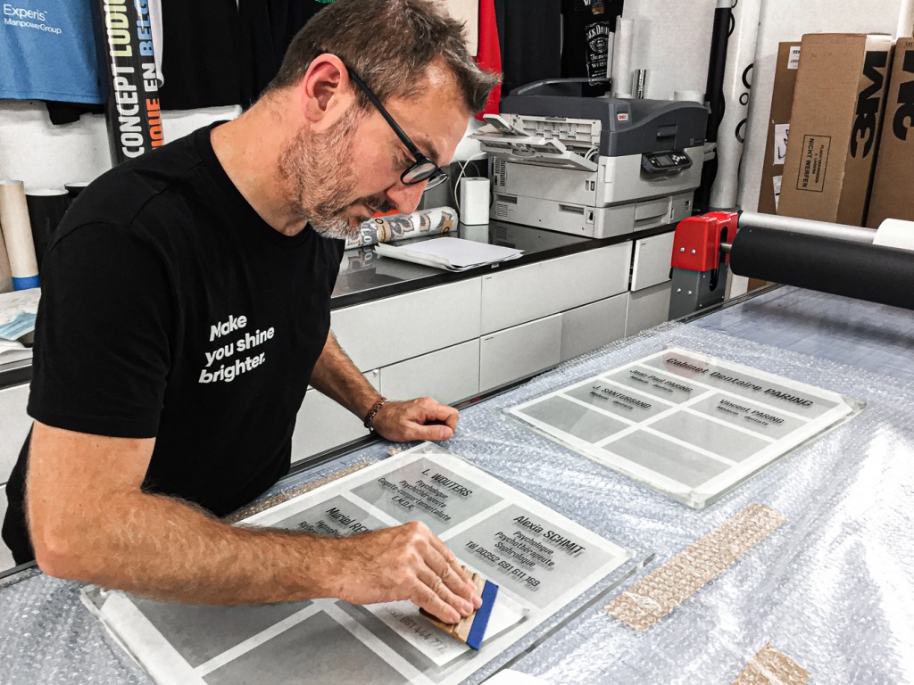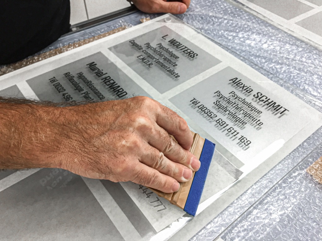 Au verso, un sablage pour permettre une meilleure visibilité et au recto, un lettrage anthracite.