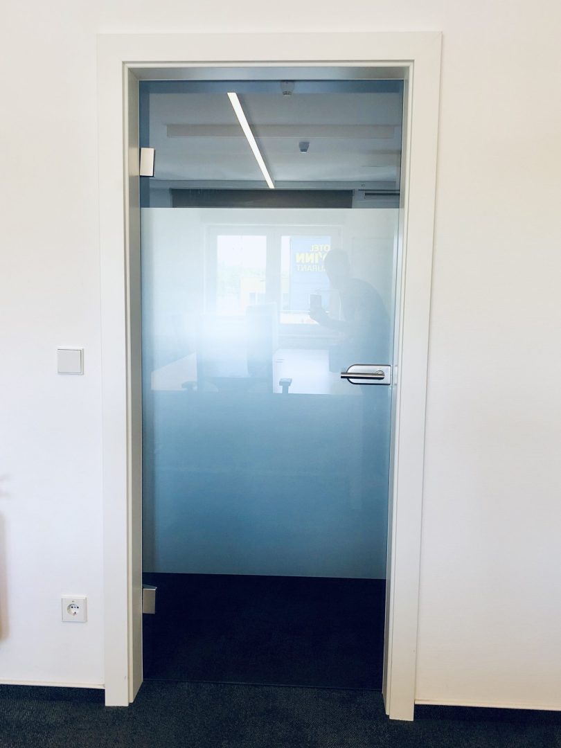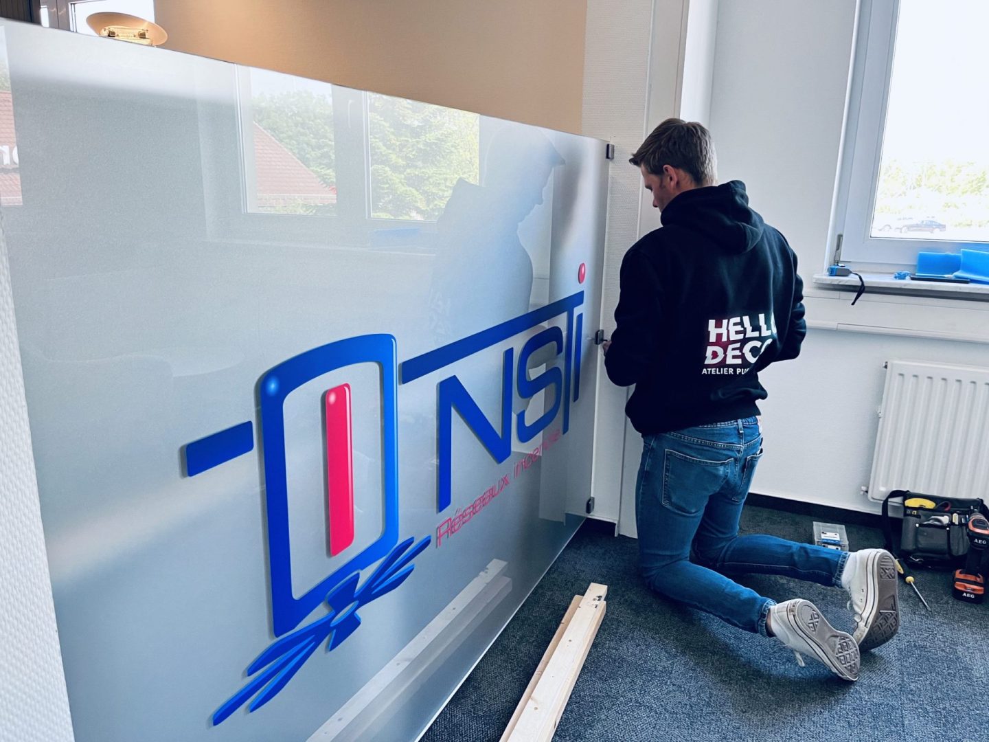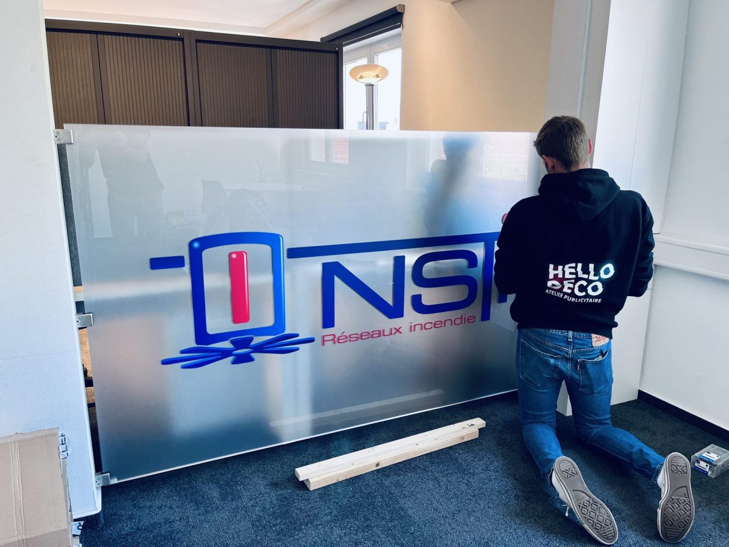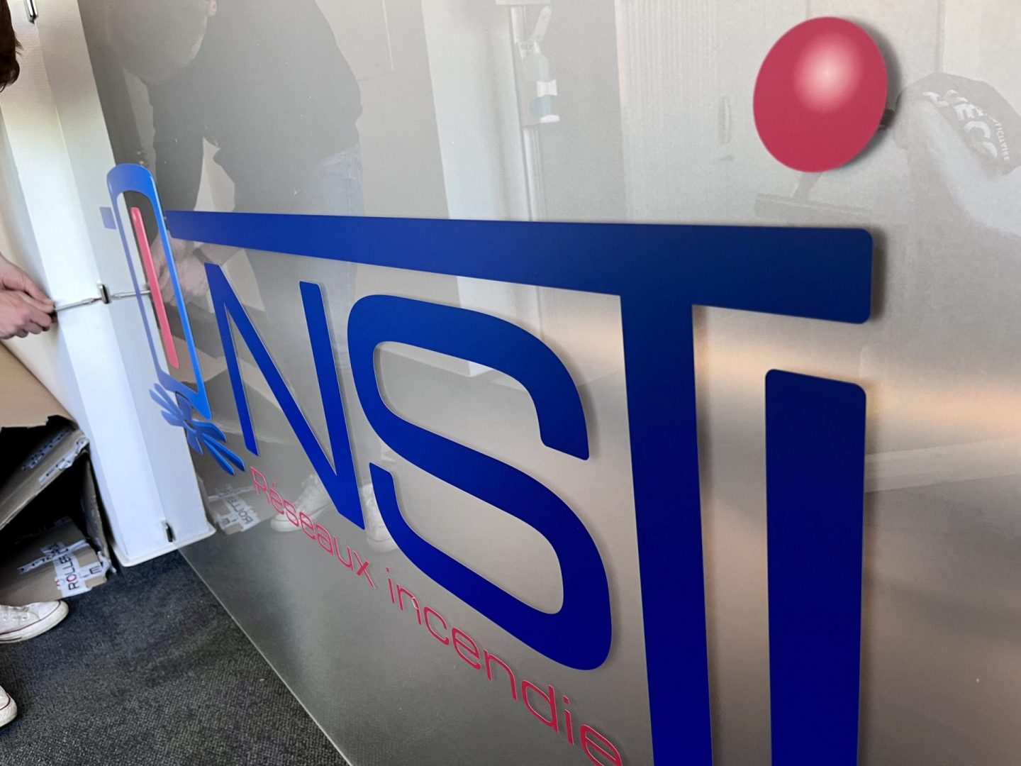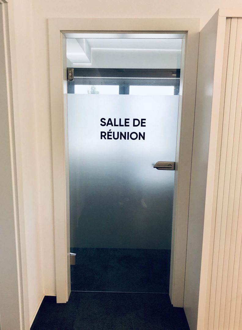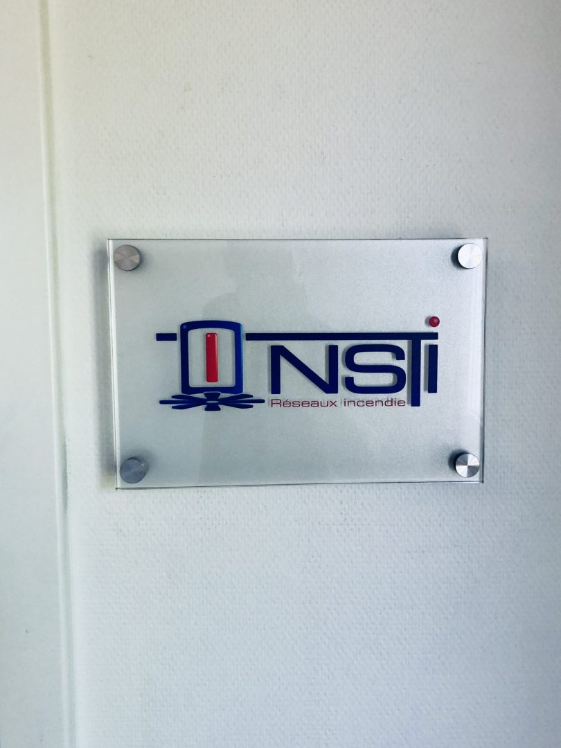 Réalisation et installation d’un grand panneau en plexi-glass avec effet sablé à l’arrière et lettrage de logo à l’avant pour la société NSTI Luxembourg. Mise en place d’un système C-Clamp dans l’encadrement du mur pour le fixer. Et pour gagner en intimité et concentration, sablage de portes de bureaux !