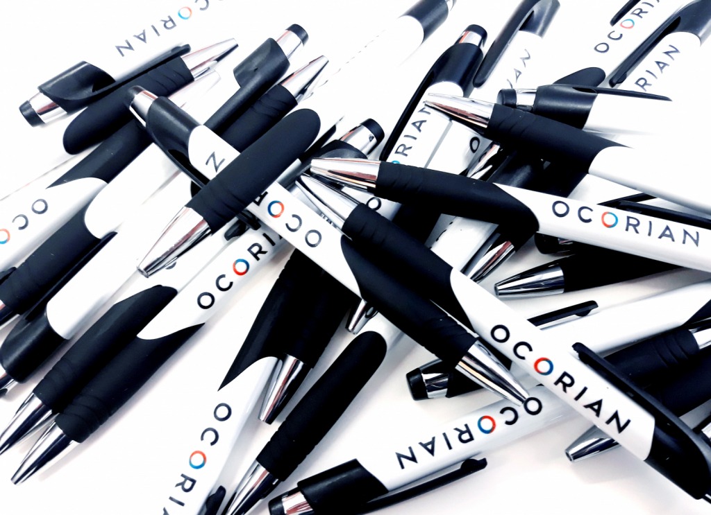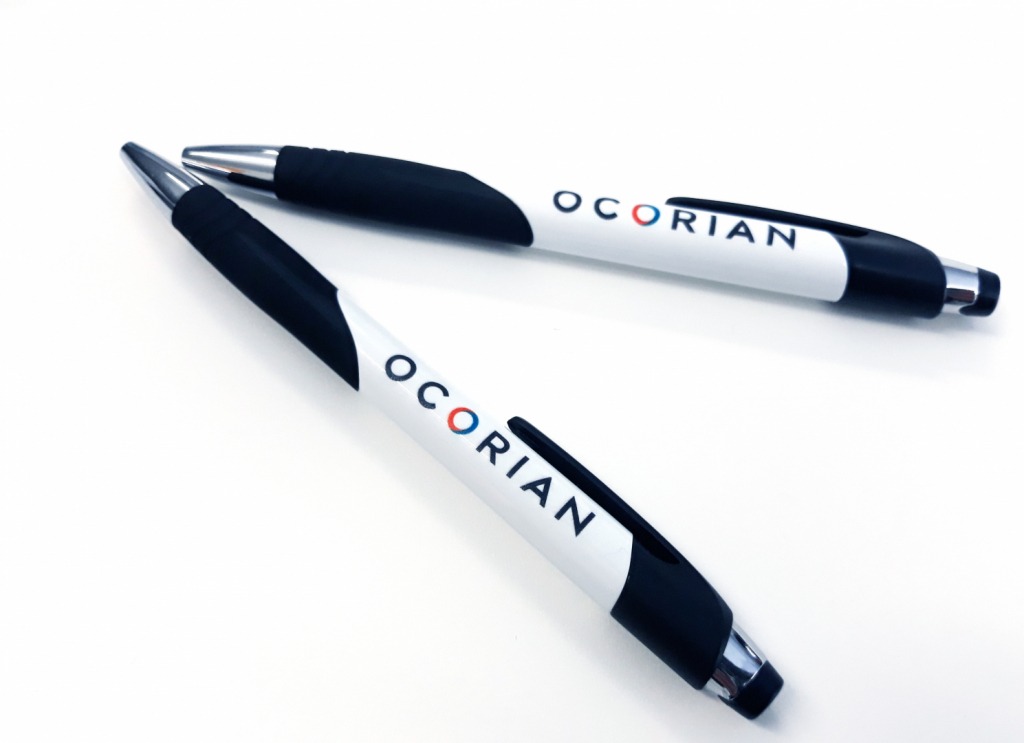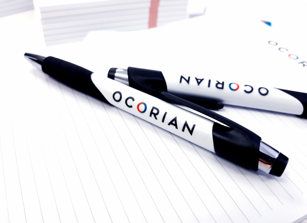 Ocorian, après un re-branding complet de sa société, souhait augmenter sa visibilité au travers de stylo billes à offrir à ses employés et à ses clients après la production de post-it et de bloc-notes. Il s’agit d’un support idéal qui vous accompagne partout, mêmes dans les salons et les événements corporate.