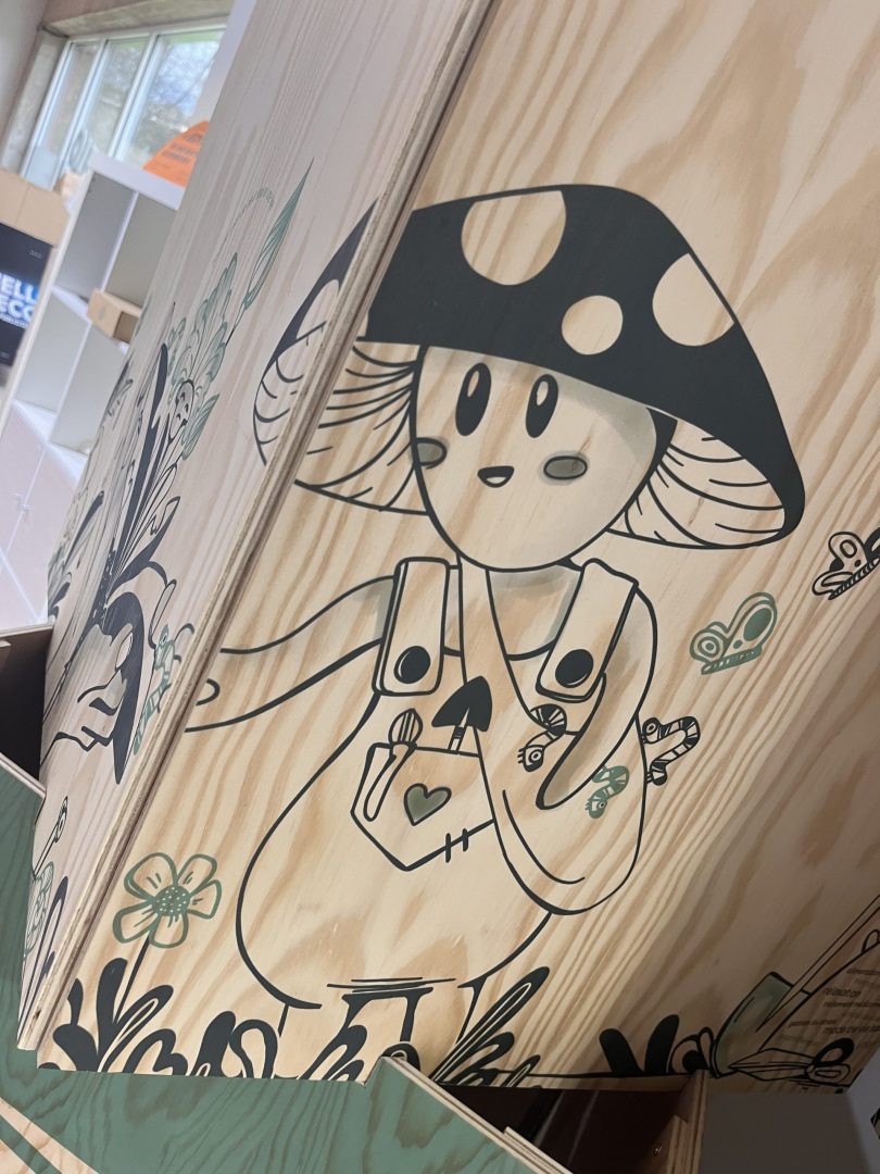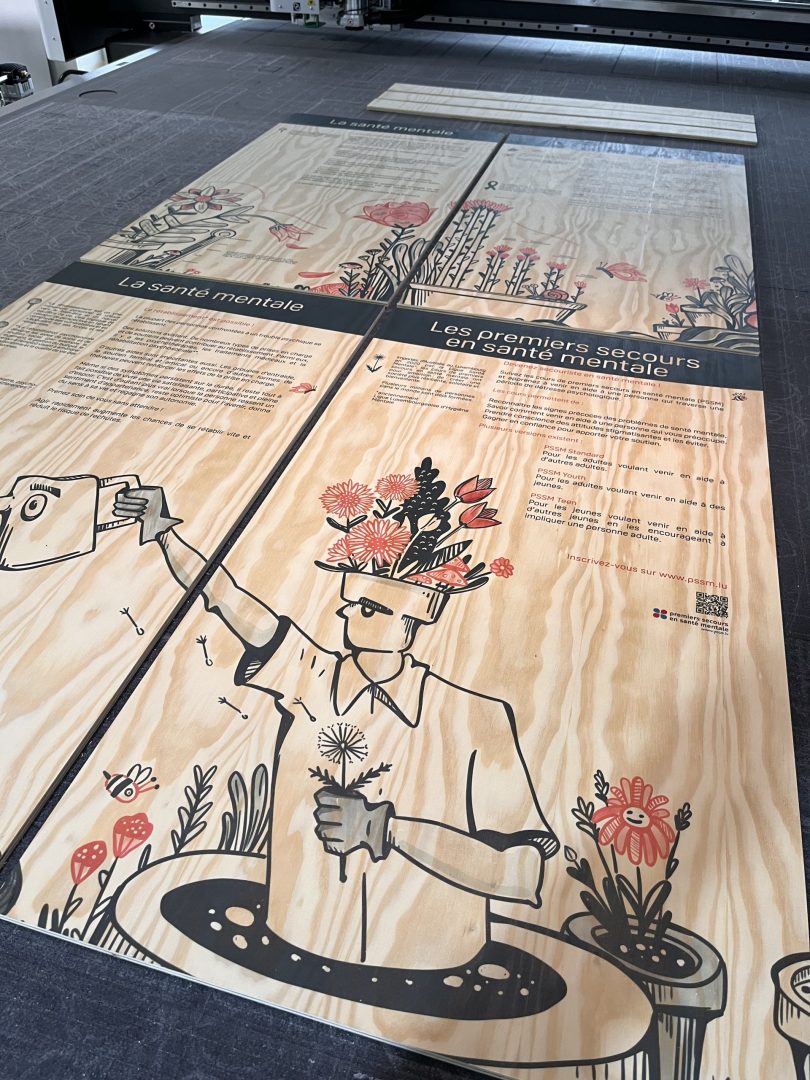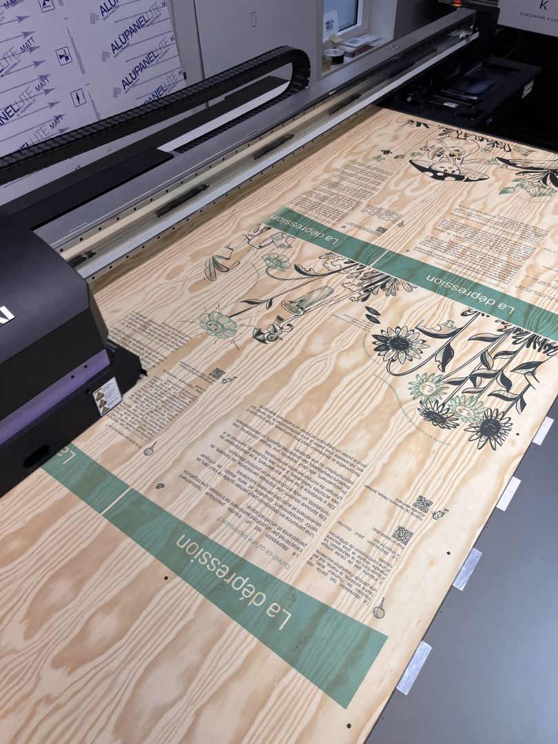 Pour répondre aux besoins d’Indira, graphiste indépendante, nous avons conçu des totems en bois multiplex, imprimés en direct UV sans blanc de soutien. Ce procédé innovant met en valeur la texture naturelle du bois, offrant un rendu authentique et impactant.