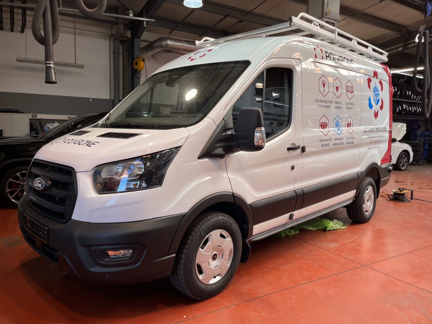 Hello Deco a réalisé le marquage de deux véhicules utilitaires Ford Transit pour Polygone. Cette intervention comprend un covering partiel et des lettrages adhésifs, conçus pour assurer une visibilité optimale sur la route. Grâce à un design impactant, ces véhicules deviennent de véritables supports de communication mobiles, renforçant l’image de marque de l’entreprise.