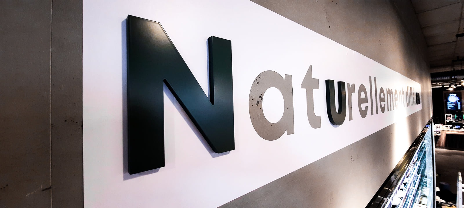 On pense souvent aux stickers pour placer un texte en intérieur, mais il existe d’autres solutions : les lettrages « 3D » avec des lettres acryliques, dibond, pvc, …