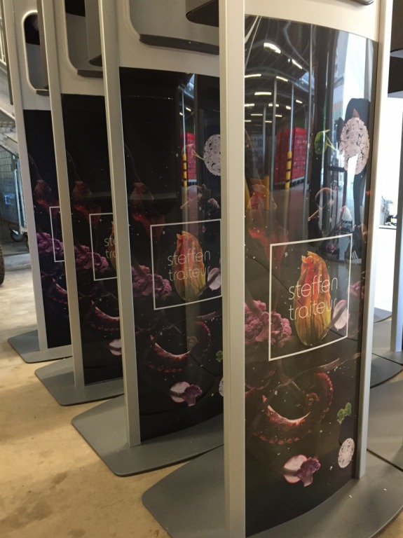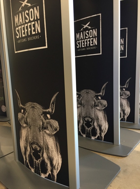 Maison Steffen nous a confié l’habillage de bornes de gel hydroalcoolique aux couleurs de son identité après avoir dû s’adapter face à la Covid-19.