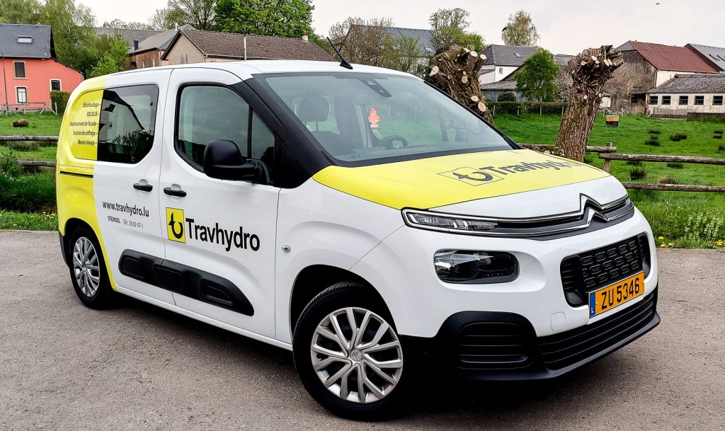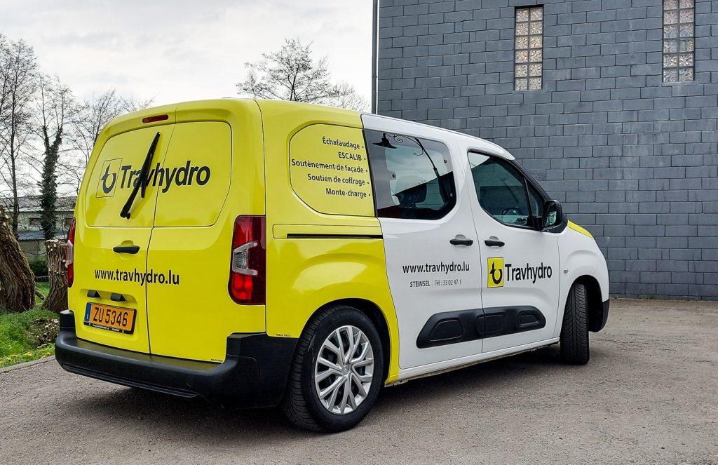 Pour la société Travhydro, un client de l’agence de communication Yellow Luxembourg, réalisation d’un covering partiel de deux camionnettes.
