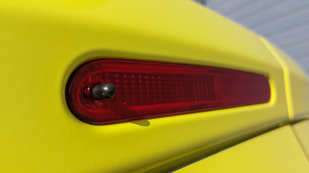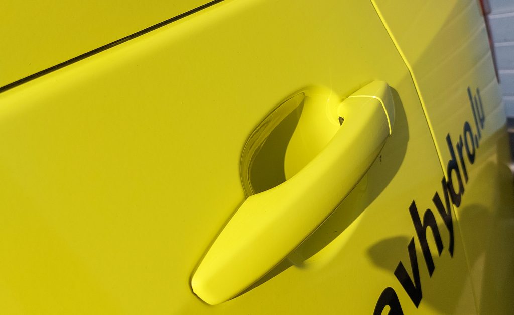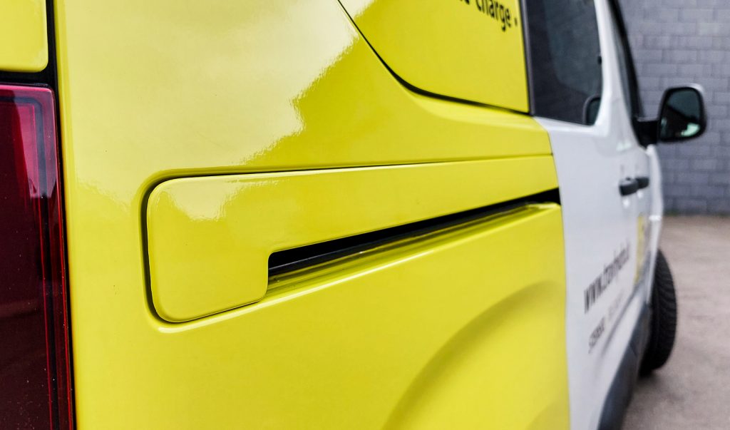 Après le démontage nécessaire des éléments de carrosserie, une déformation thermique du vinyle (technique par emboutissage) a été réalisée pour pouvoir ensuite procéder à son application, suivie d’un lettrage noir classique.