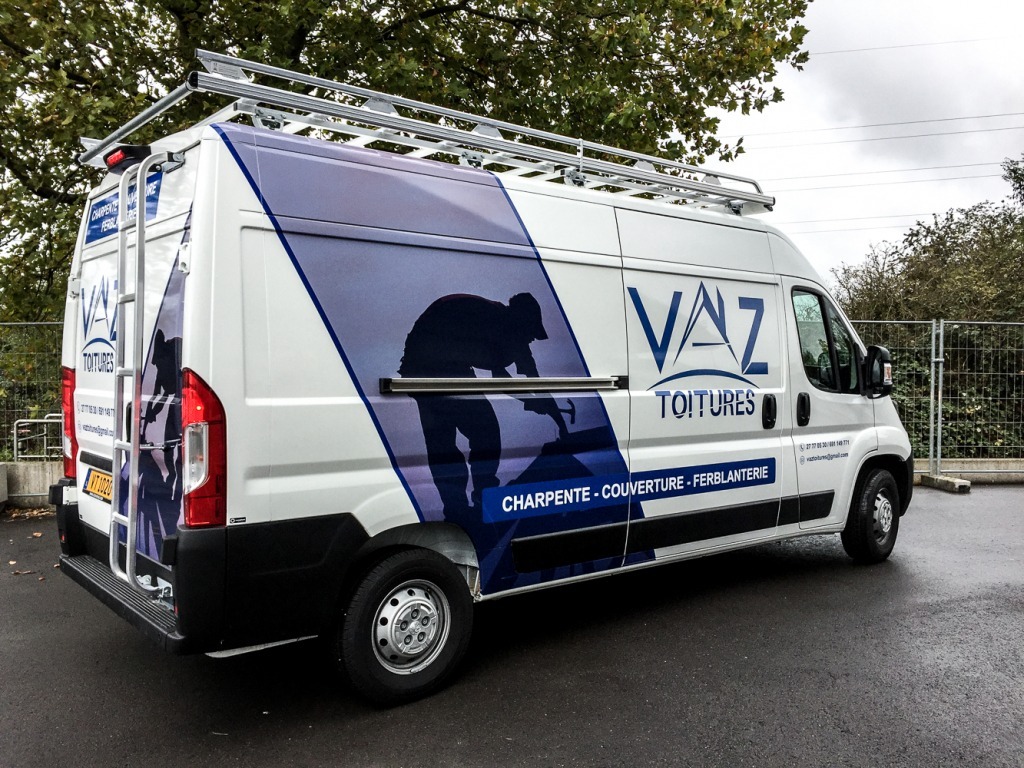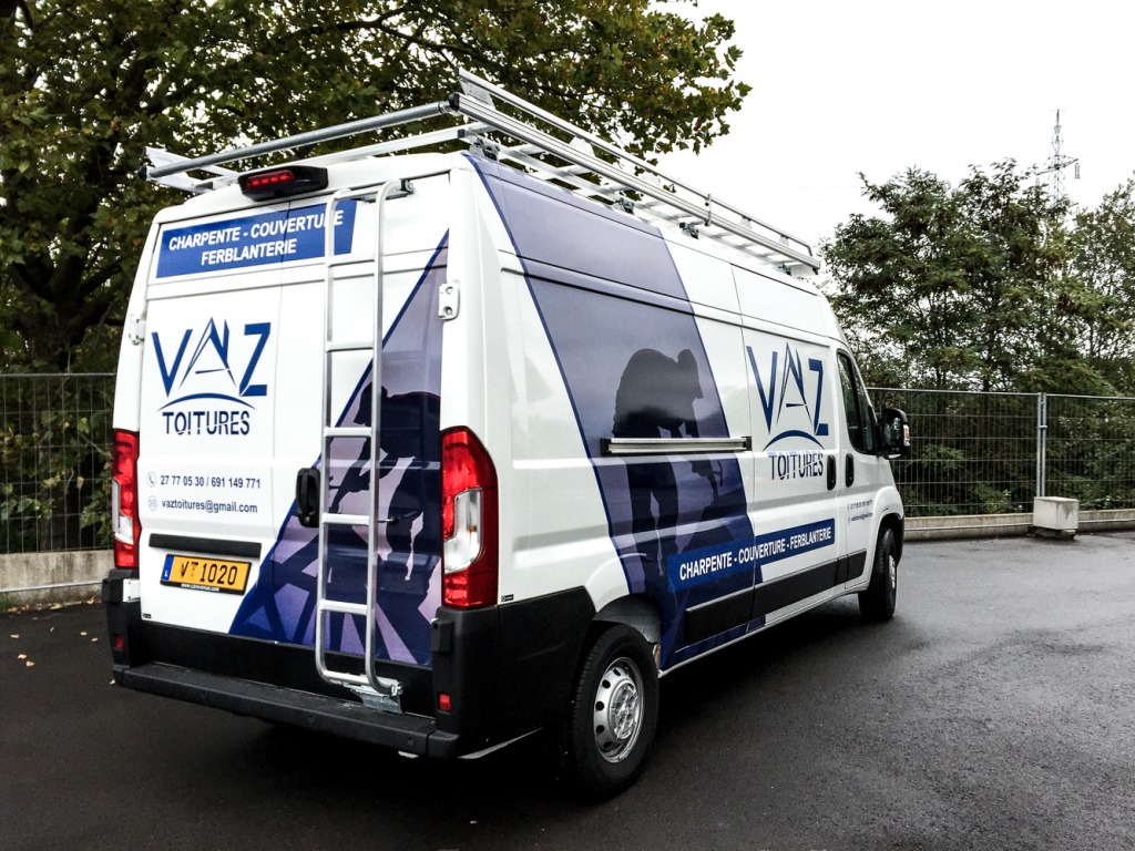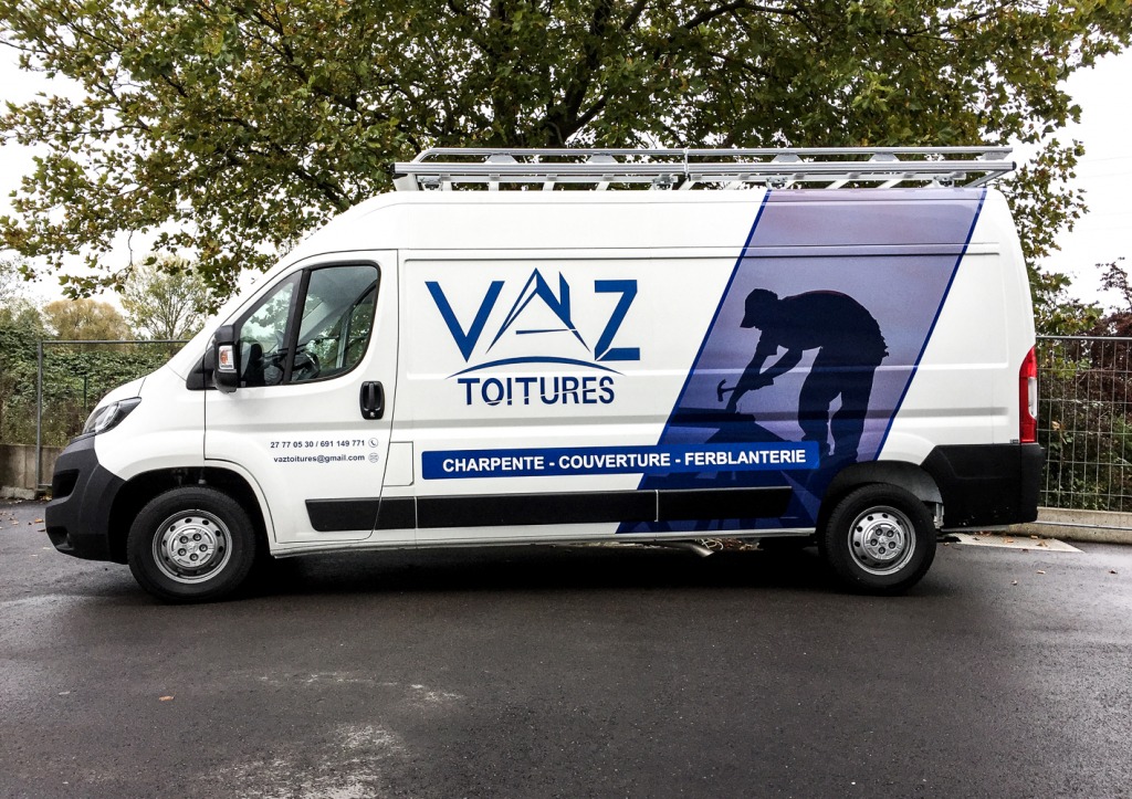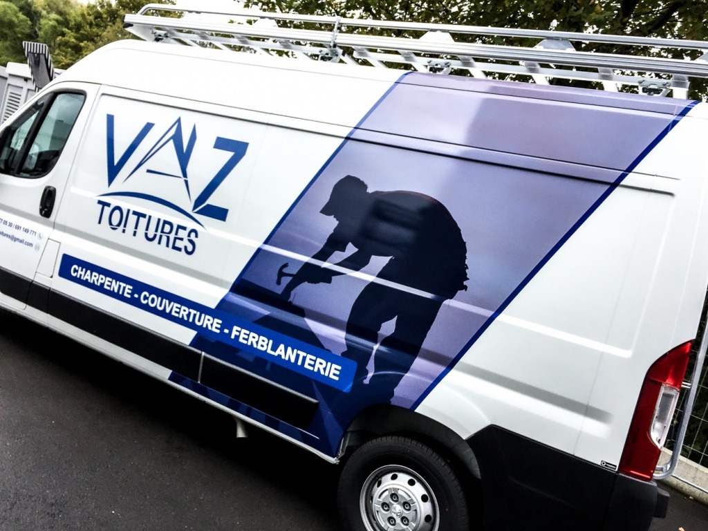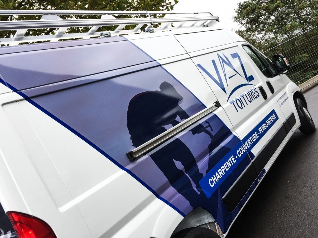 Souvenez-vous : Vaz Toitures nous avait confié la production de ses bâches de chantier. Cette fois, nous avons eu le plaisir de lettrer leur camionnette !